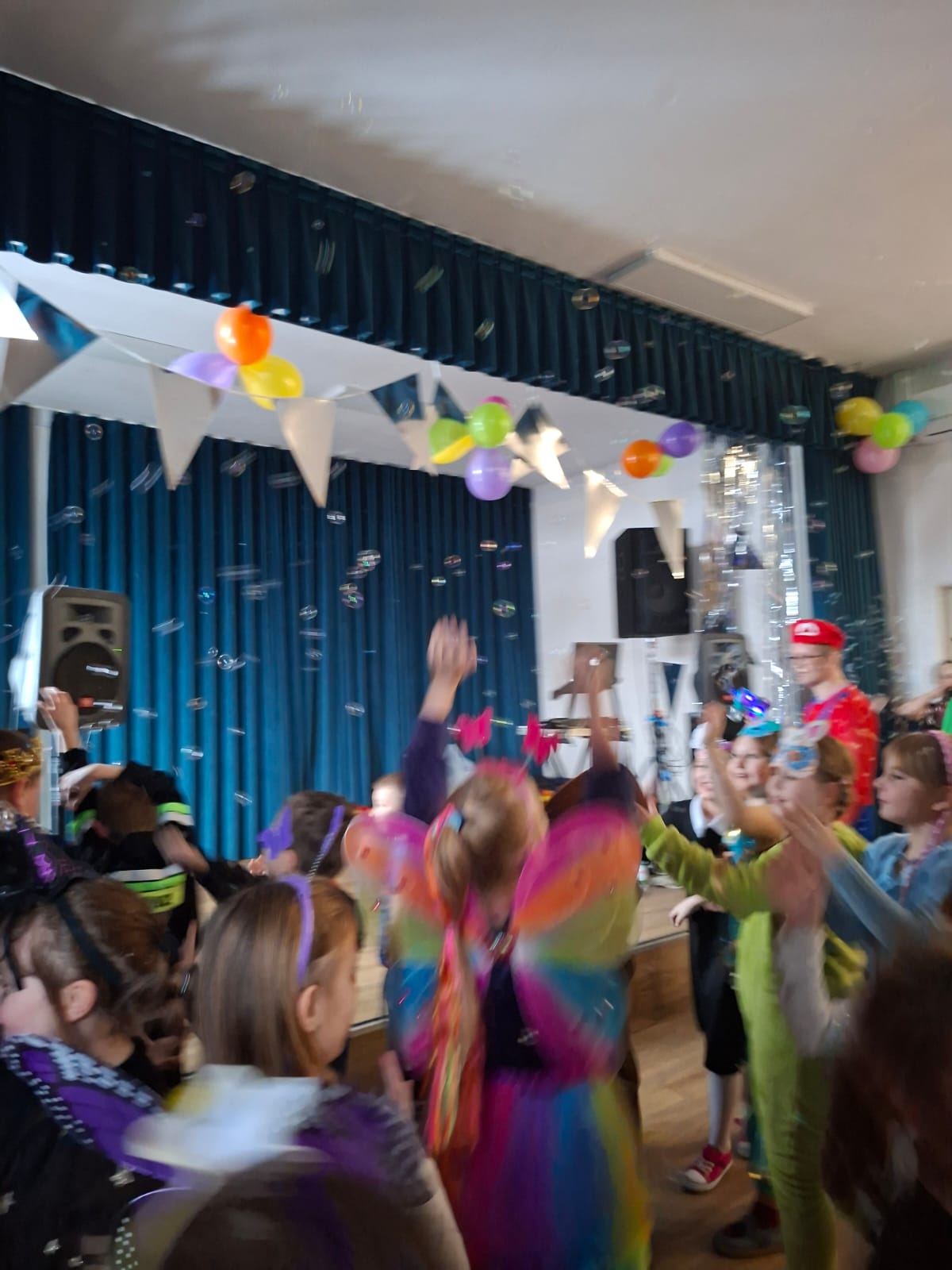 Panowie Wodzirejowie z zaangażowaniem prowadzili zabawę, dbając o doskonałą atmosferę, a łapanie baniek mydlanych okazało się jedną z największych atrakcji balu :). Radość i uśmiechy na twarzach uczniów najlepiej świadczyły o tym, jak wyjątkowe było to wydarzenie. Nic więc dziwnego, że niektórzy już teraz z niecierpliwością odliczają dni do kolejnego balu.
