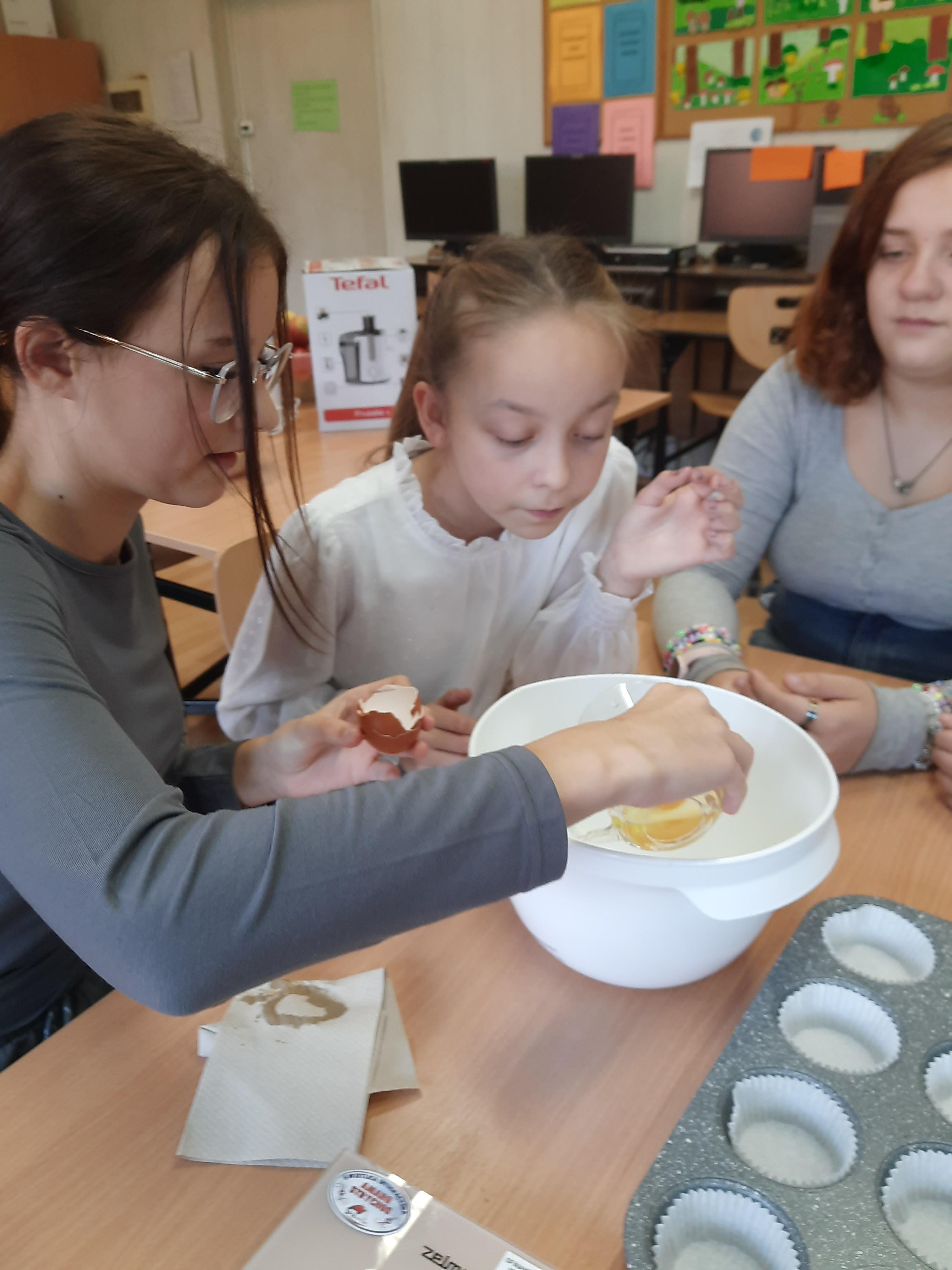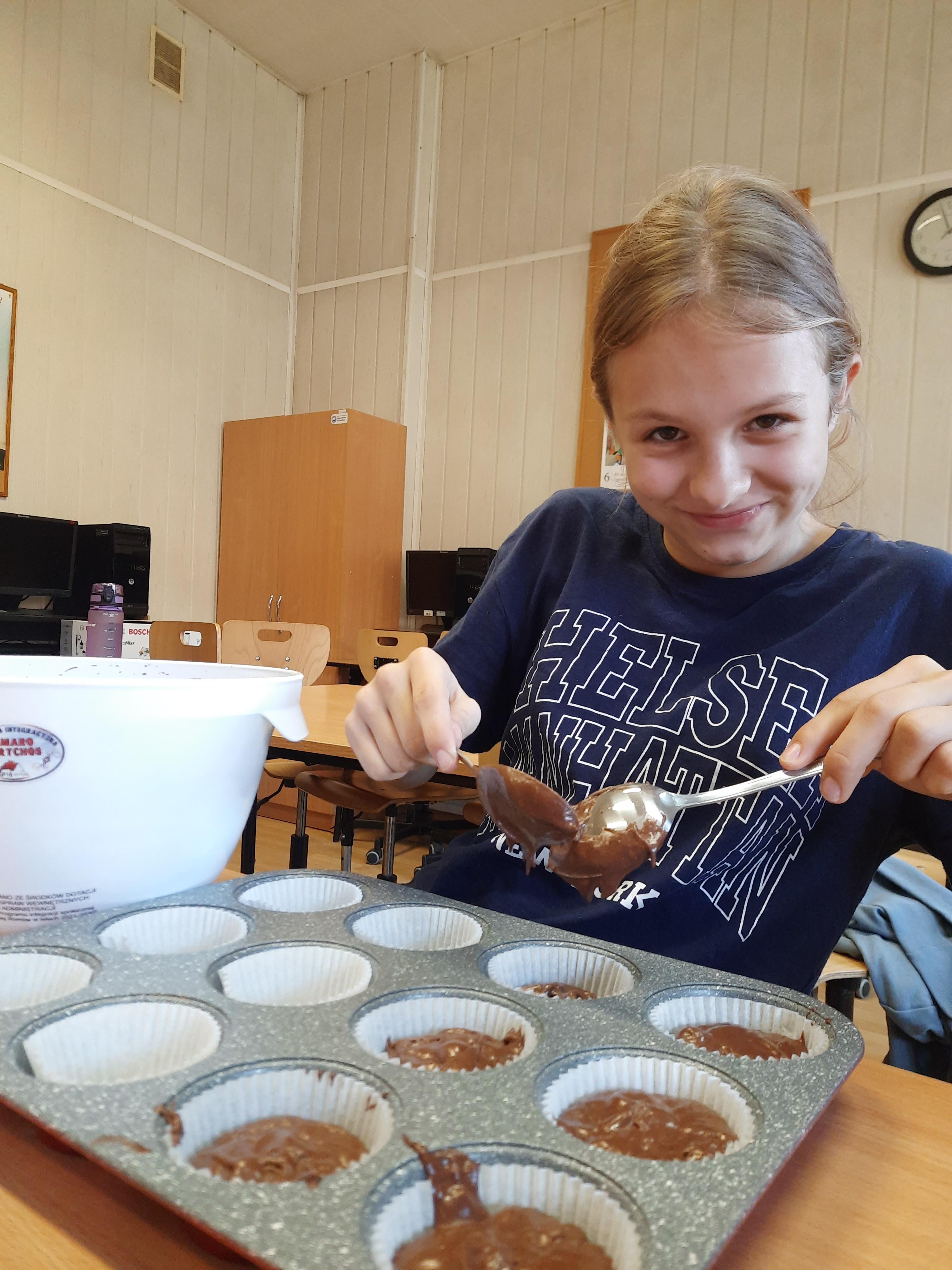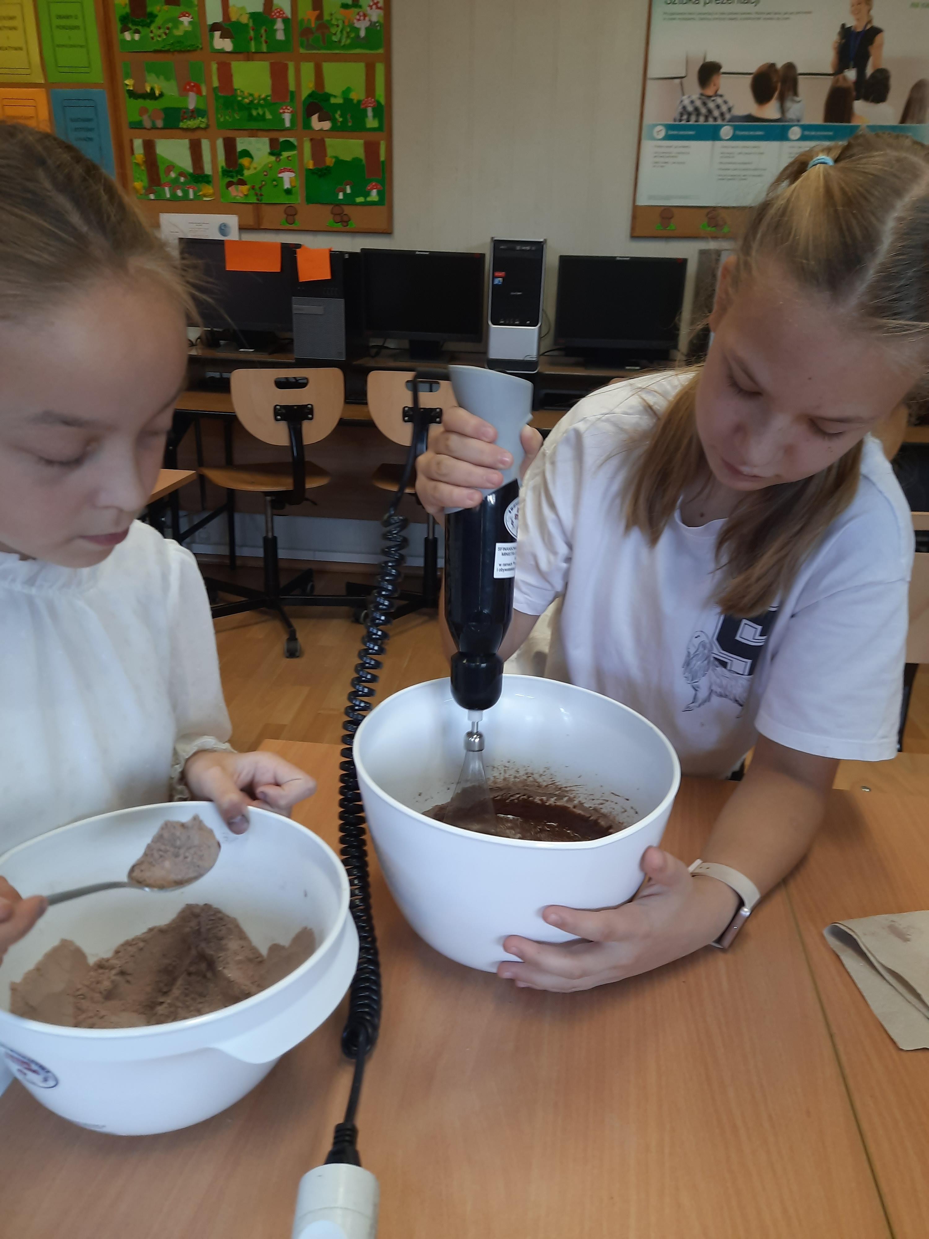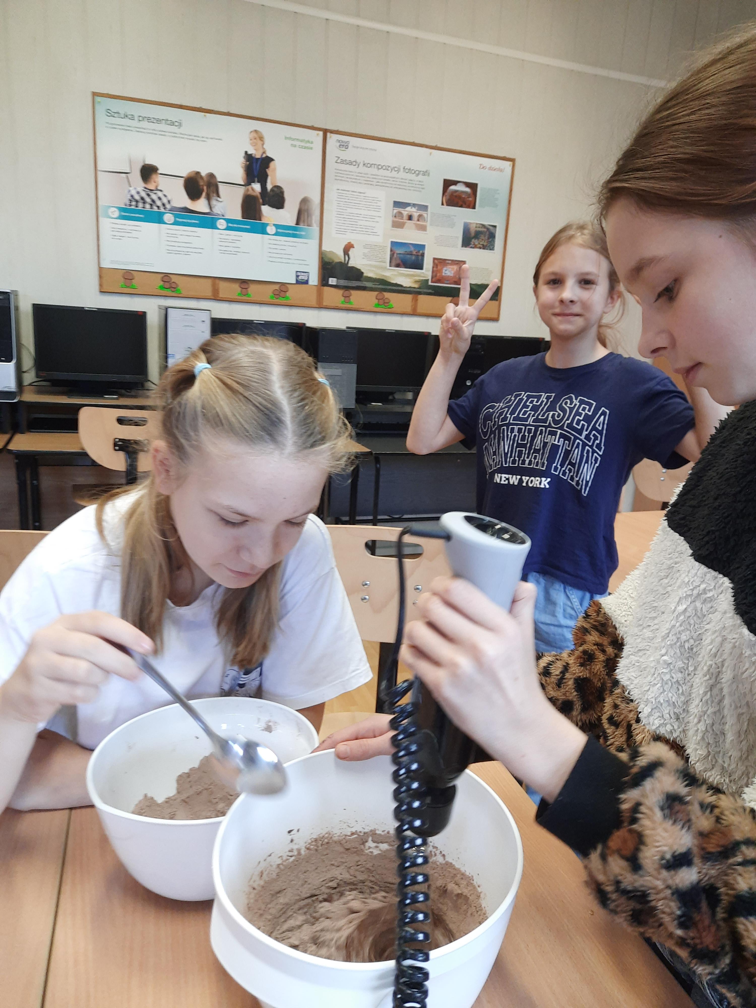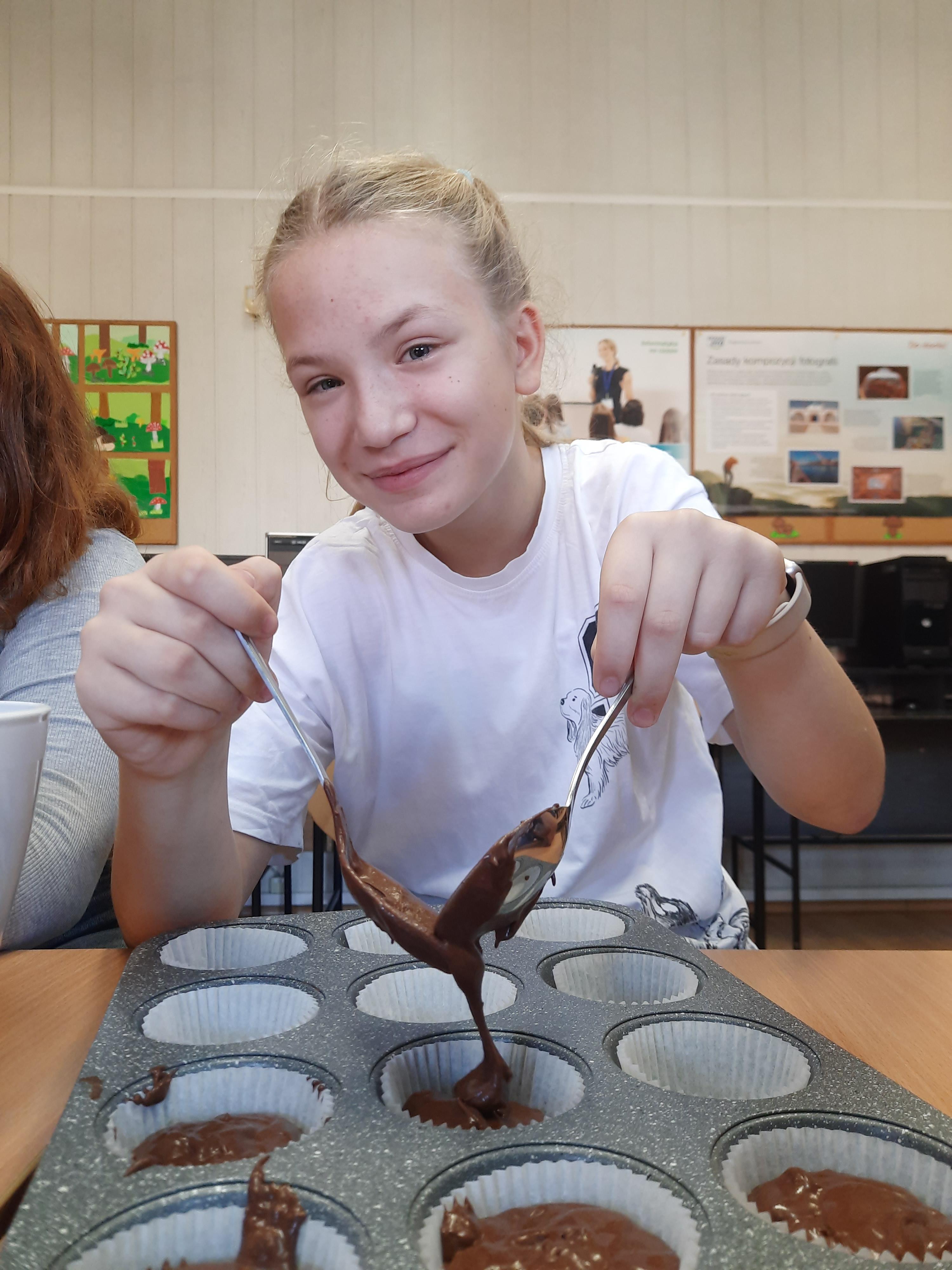 „Kreatywne zajęcia techniczne i kulinaria” rozwijają zdolności kreatywne, techniczne oraz kulinarne. Uczniowie z klasy 5b uczestniczący w zajęciach rozpoczęli kulinarną przygodę z czekoladowymi babeczkami. Nie były to jednak zwykłe słodkości – dzięki przemyślanym składnikom i wspólnej pracy, powstały wypieki nie tylko pyszne, ale i pełne wartości odżywczych. Podczas przygotowywania ciasta uczniowie dowiedzieli się, jak ważne jest precyzyjne odmierzenie składników, zachowanie higieny oraz współpraca z innymi. Największą radością była oczywiście degustacja.