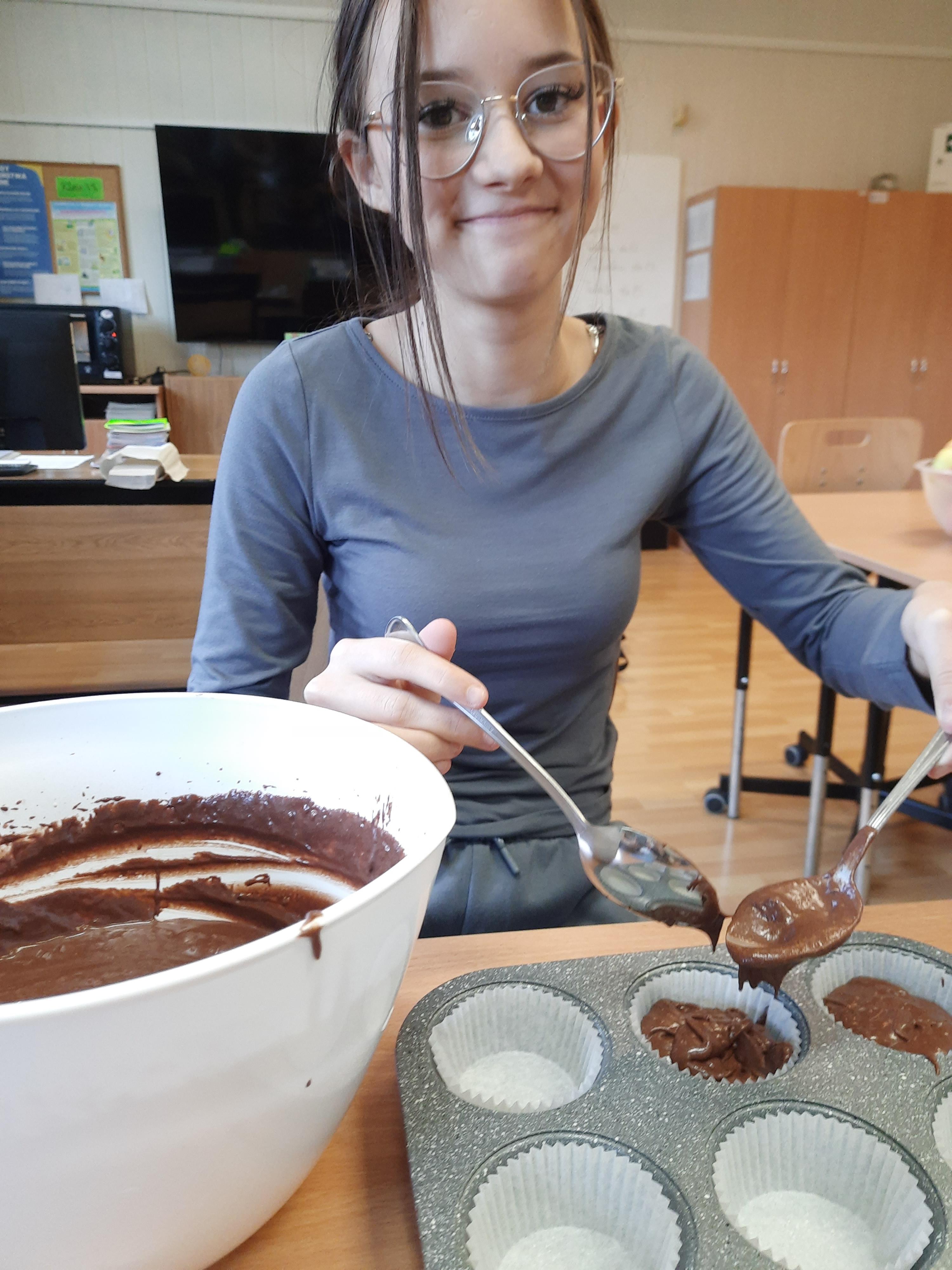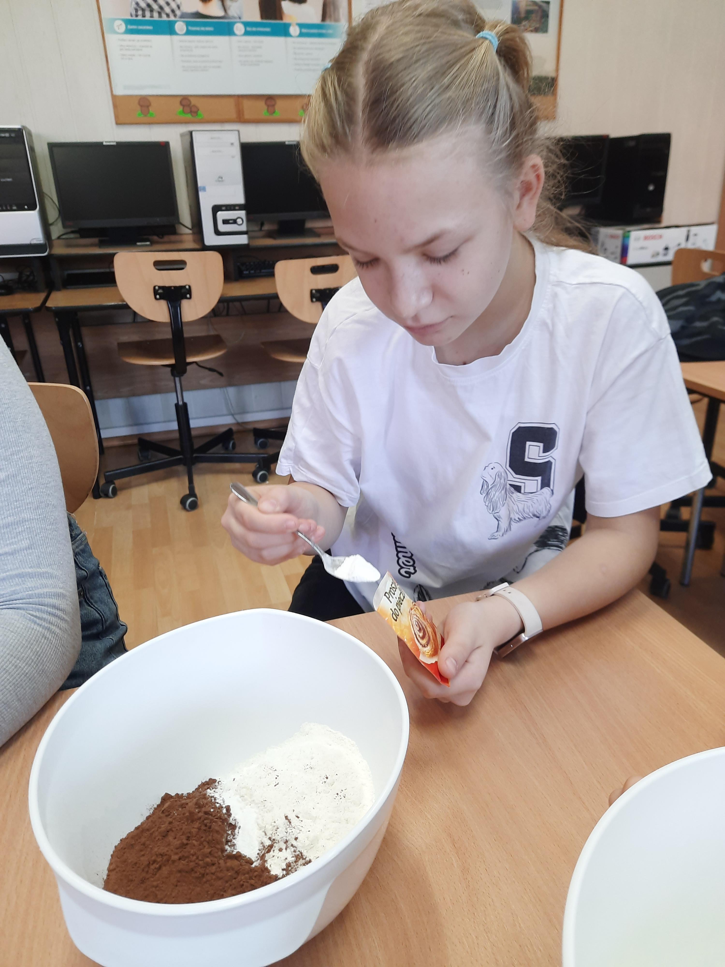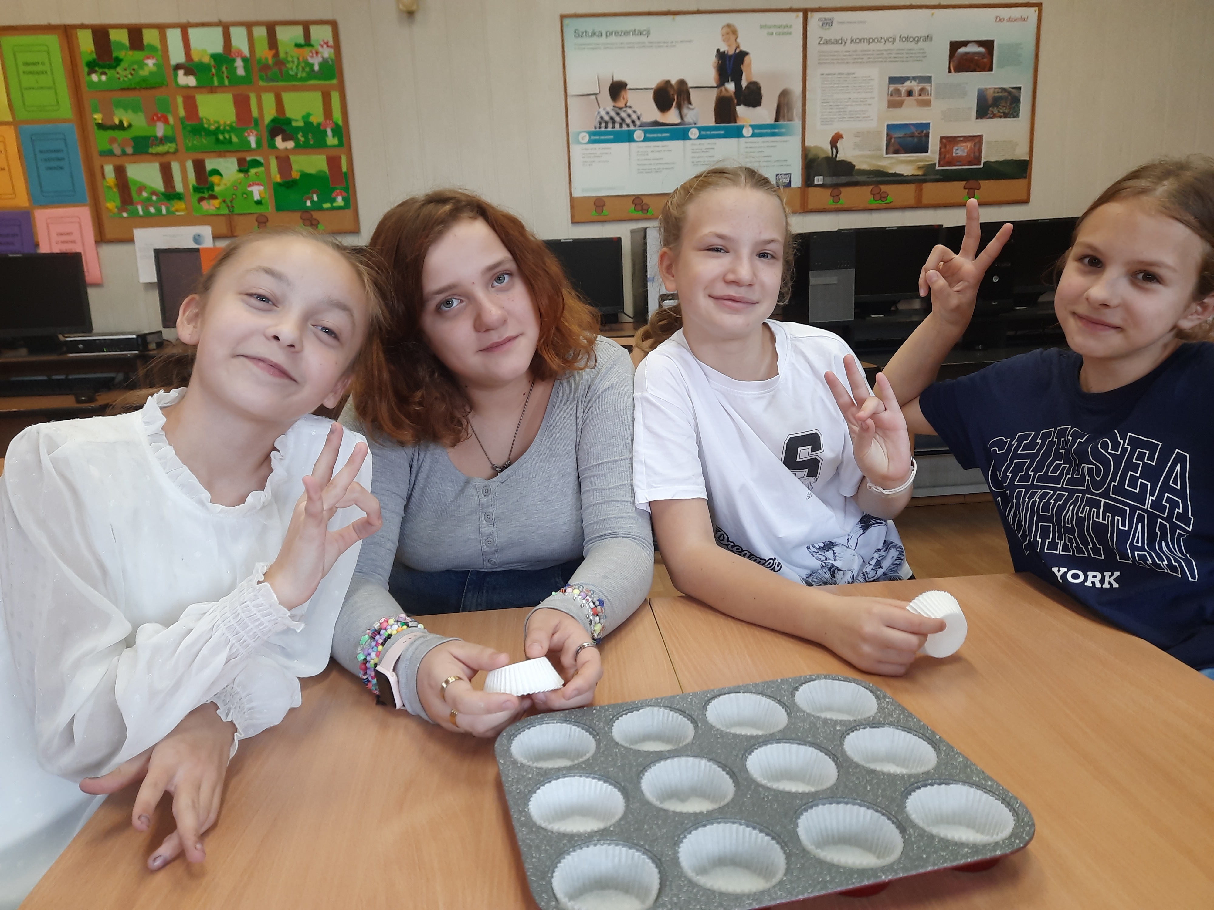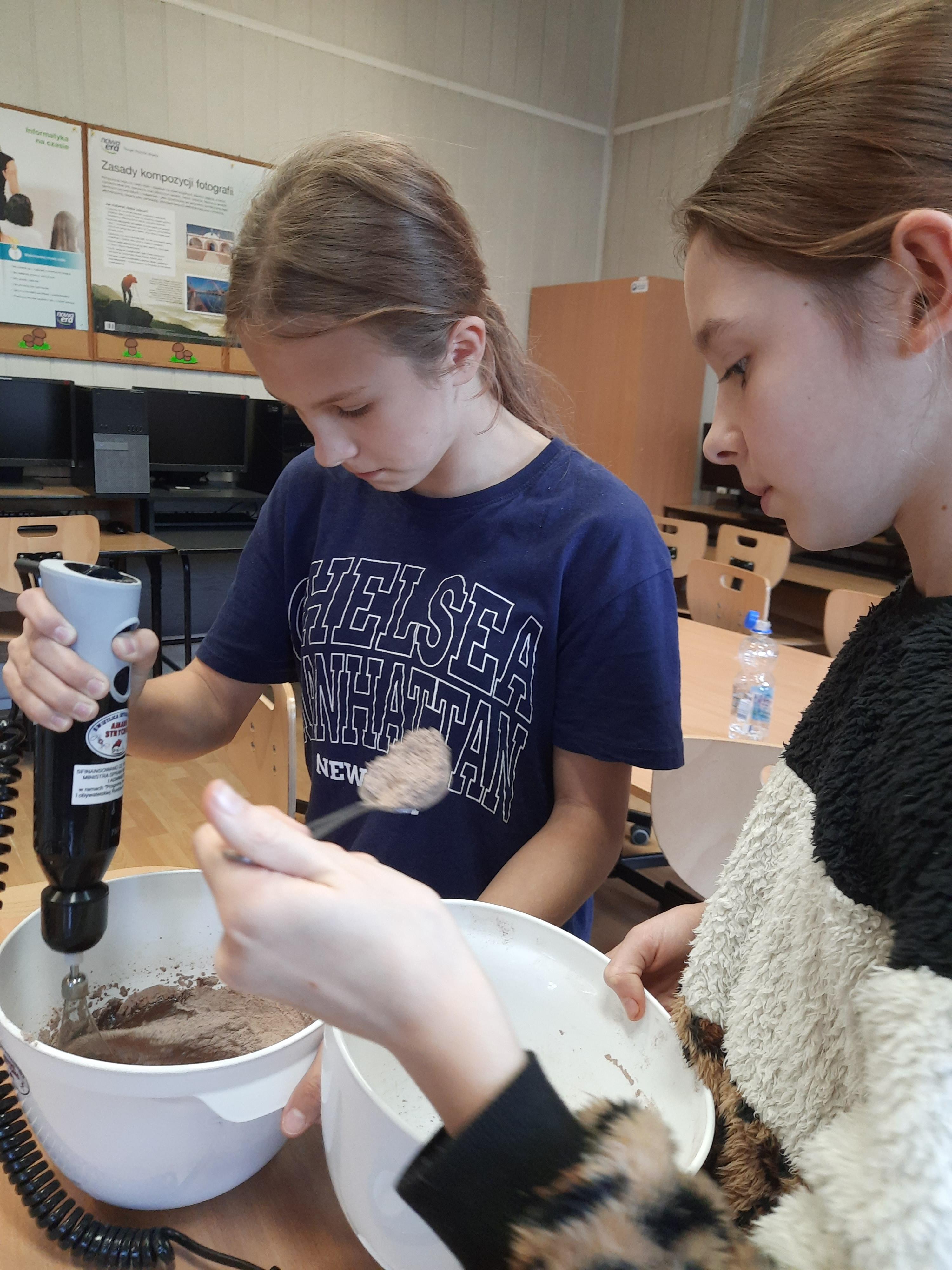 „Kreatywne zajęcia techniczne i kulinaria” rozwijają zdolności kreatywne, techniczne oraz kulinarne. Uczniowie z klasy 5b uczestniczący w zajęciach rozpoczęli kulinarną przygodę z czekoladowymi babeczkami. Nie były to jednak zwykłe słodkości – dzięki przemyślanym składnikom i wspólnej pracy, powstały wypieki nie tylko pyszne, ale i pełne wartości odżywczych. Podczas przygotowywania ciasta uczniowie dowiedzieli się, jak ważne jest precyzyjne odmierzenie składników, zachowanie higieny oraz współpraca z innymi. Największą radością była oczywiście degustacja.