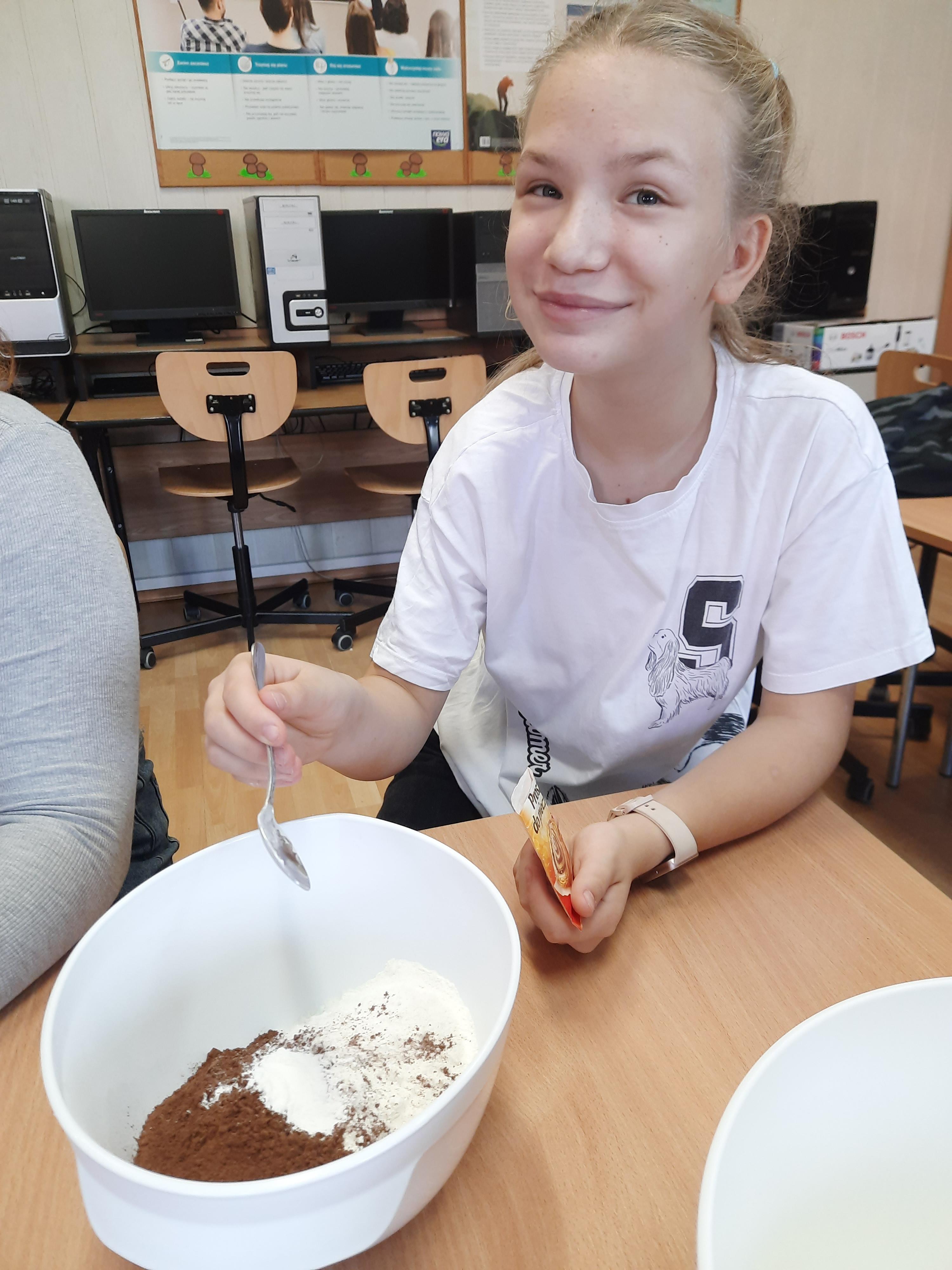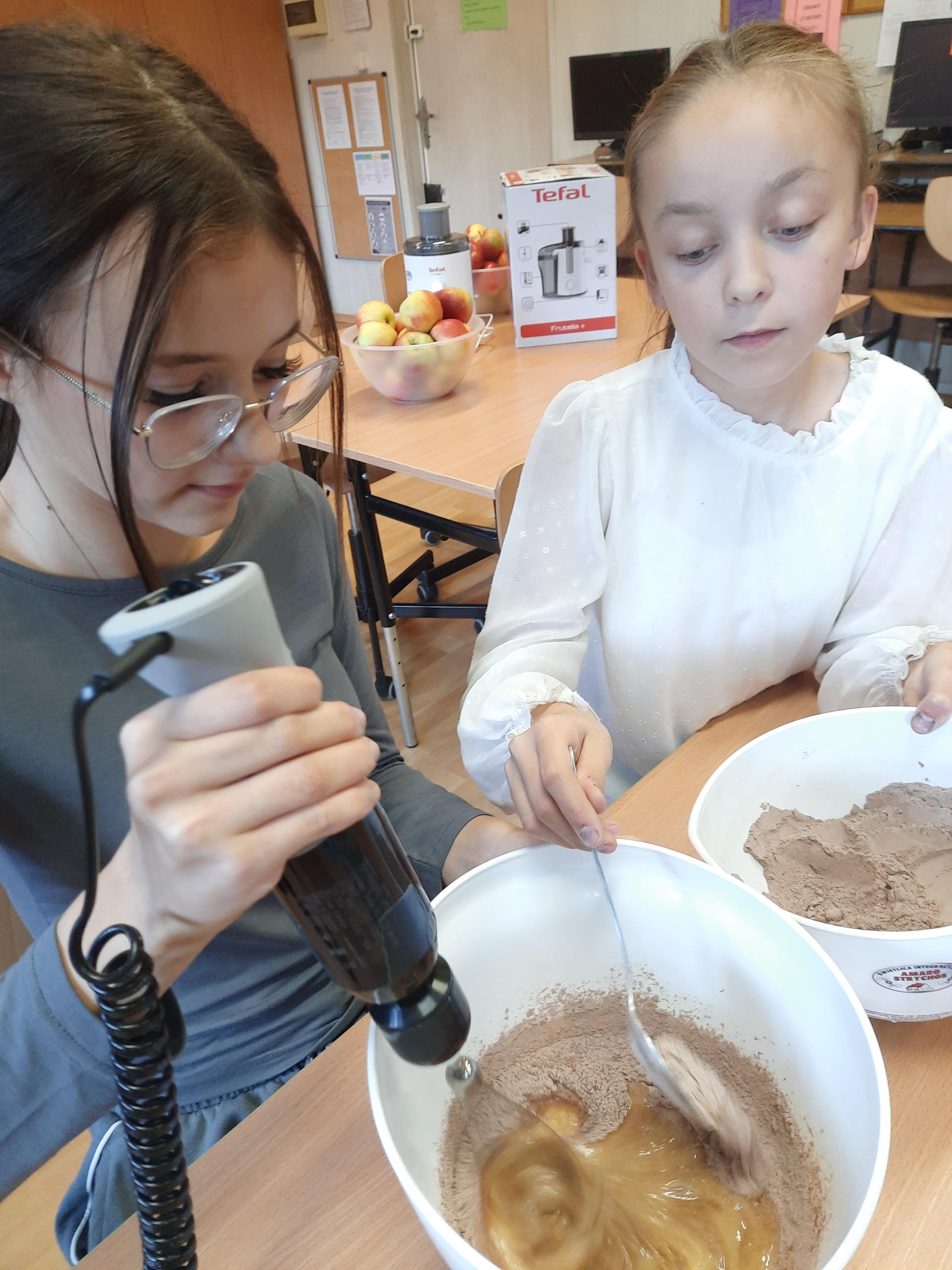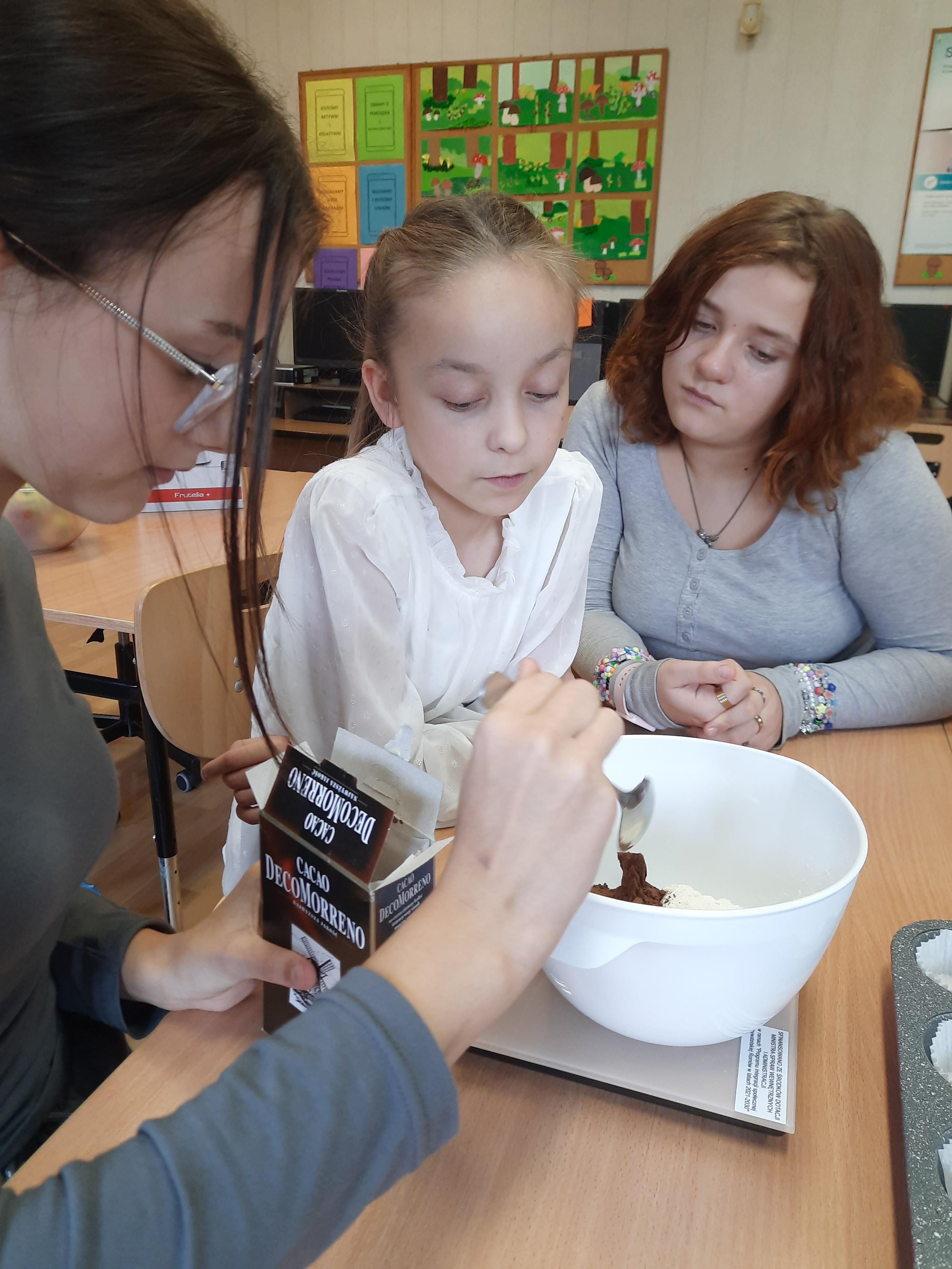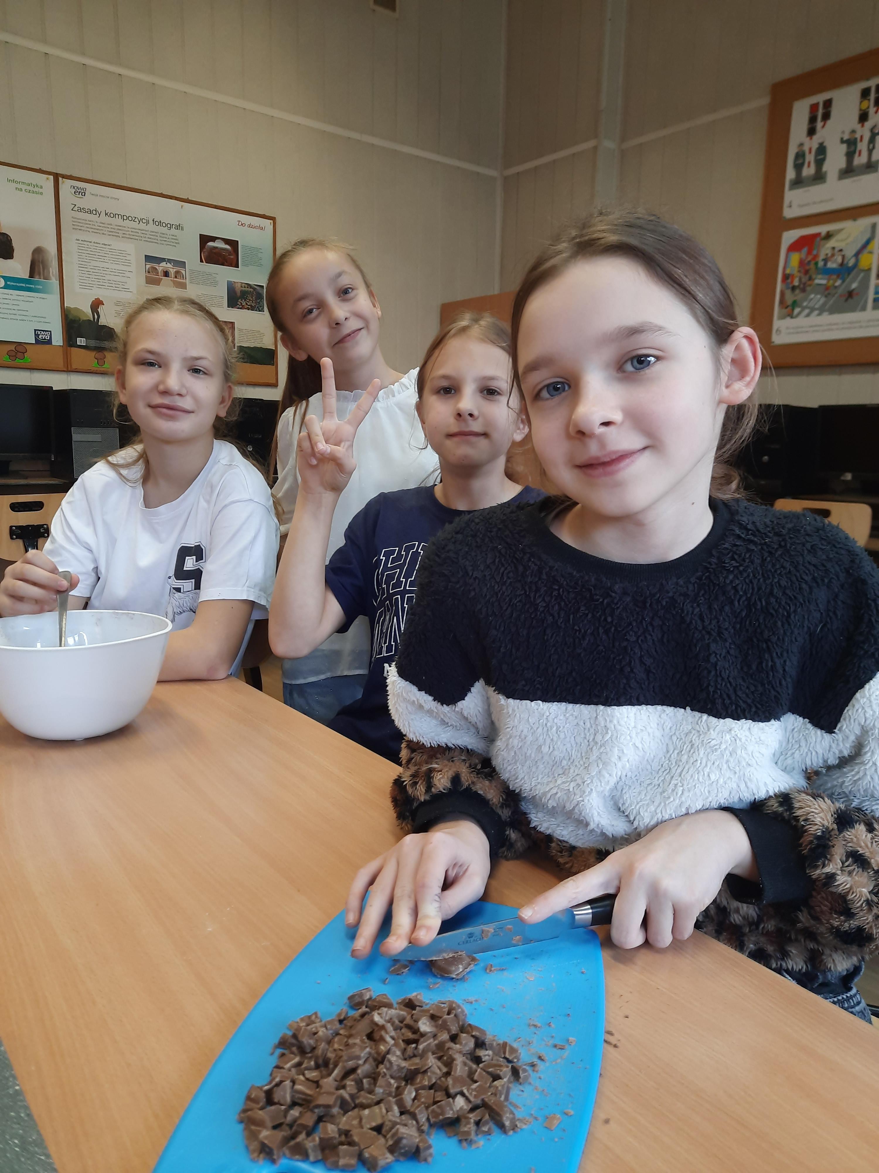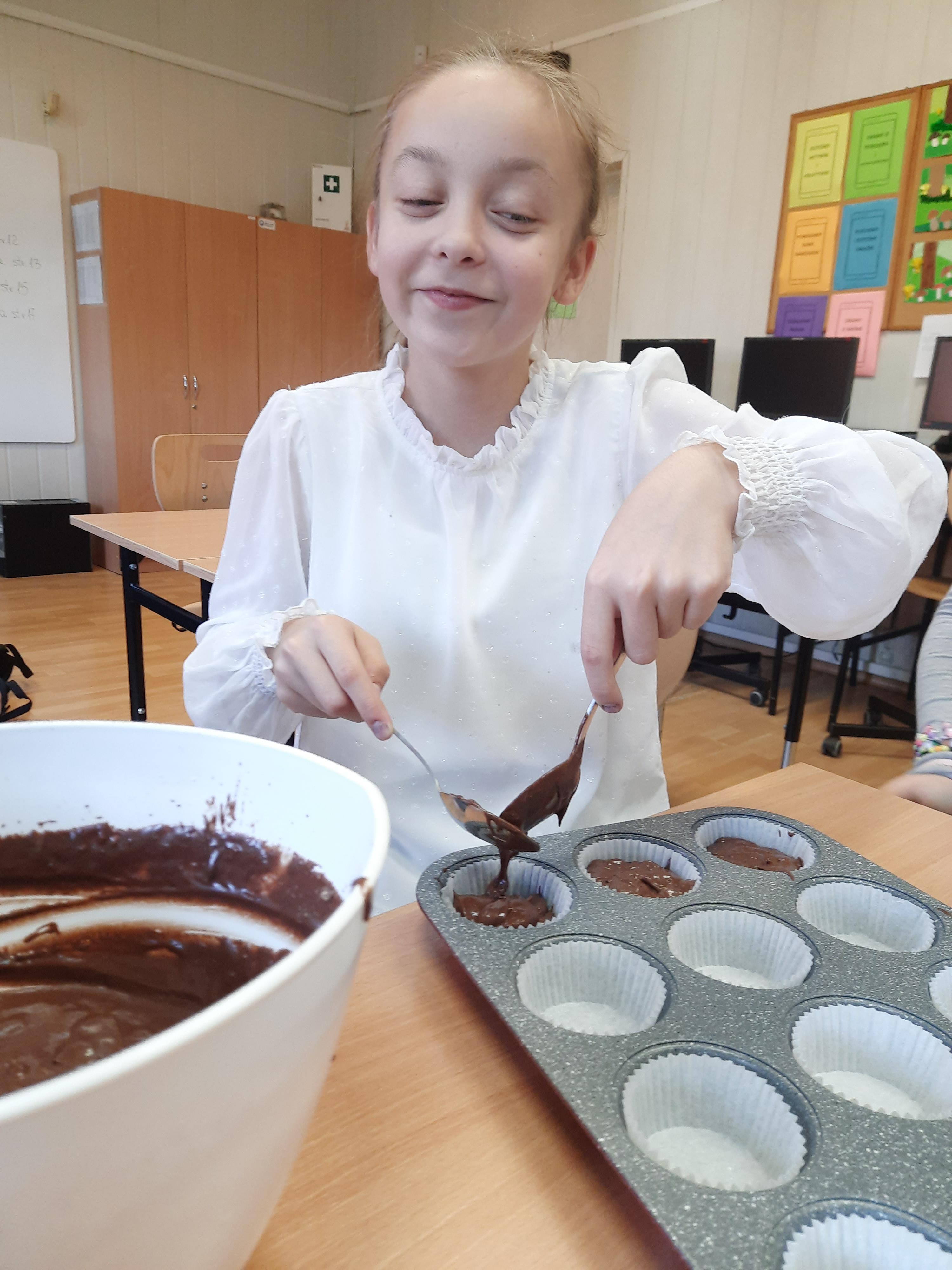 „Kreatywne zajęcia techniczne i kulinaria” rozwijają zdolności kreatywne, techniczne oraz kulinarne. Uczniowie z klasy 5b uczestniczący w zajęciach rozpoczęli kulinarną przygodę z czekoladowymi babeczkami. Nie były to jednak zwykłe słodkości – dzięki przemyślanym składnikom i wspólnej pracy, powstały wypieki nie tylko pyszne, ale i pełne wartości odżywczych. Podczas przygotowywania ciasta uczniowie dowiedzieli się, jak ważne jest precyzyjne odmierzenie składników, zachowanie higieny oraz współpraca z innymi. Największą radością była oczywiście degustacja.