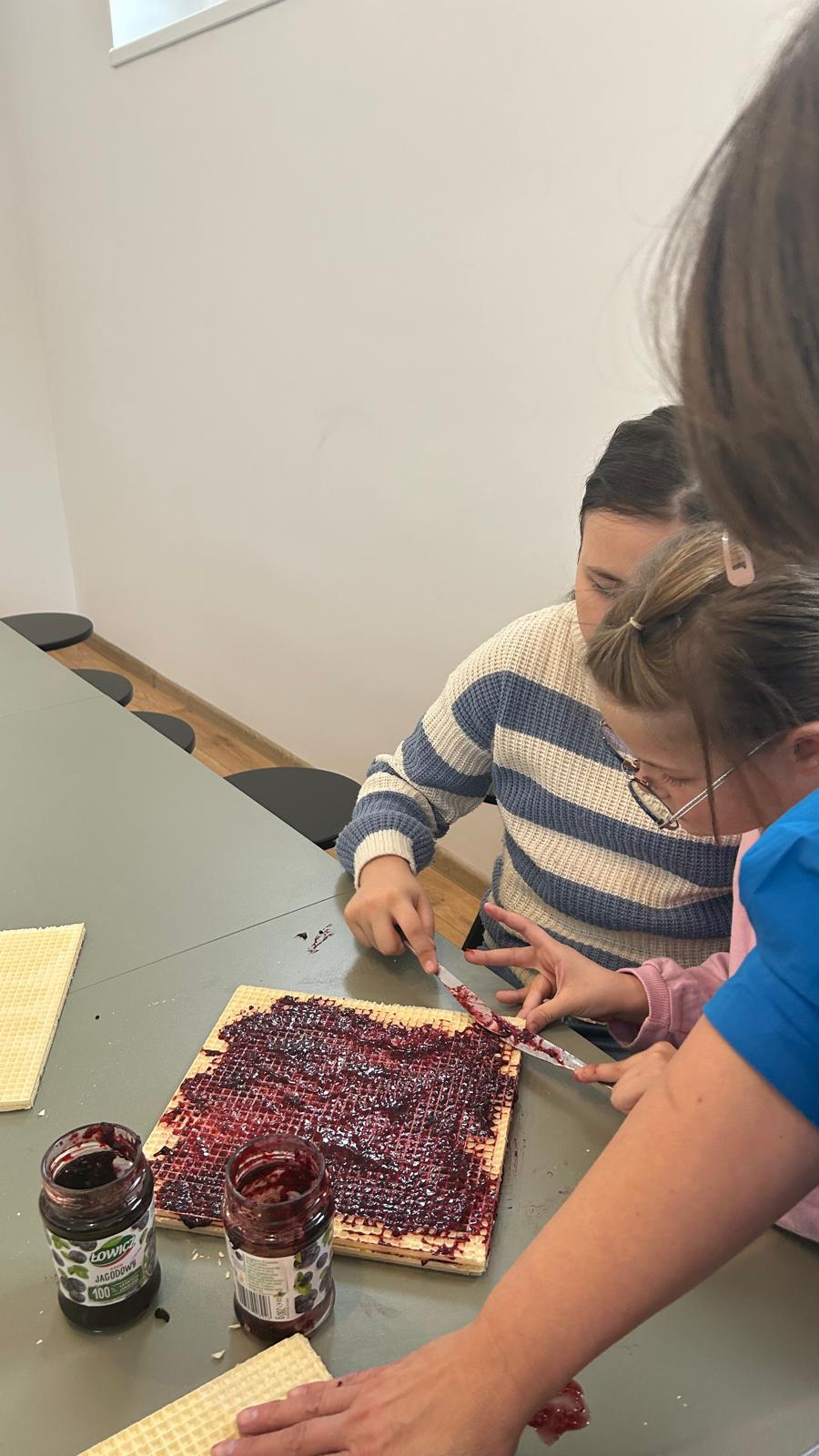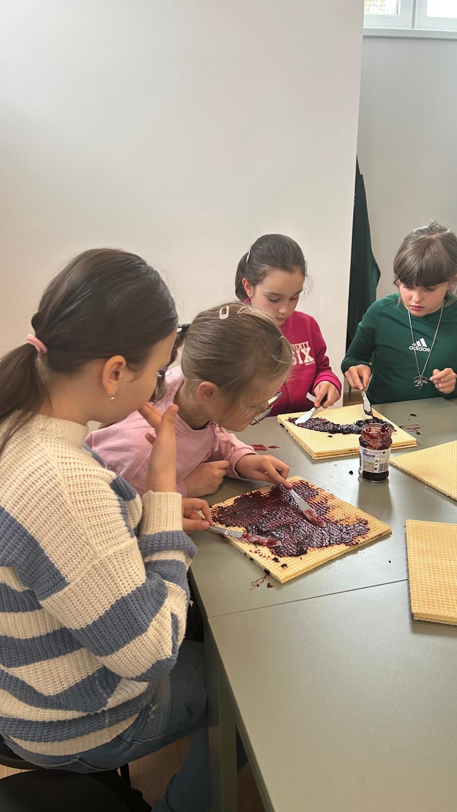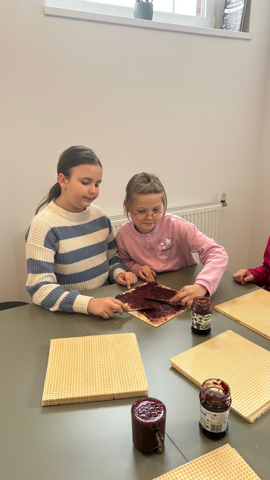 Podczas pierwszych zajęć w nowiutkiej „Kuchni Marzeń” nasi mali kucharze zmierzyli się z legendarnym deserem – domowymi piszingerami! Z ogromnym zaangażowaniem i uśmiechami na twarzach dzieci przekładały chrupiące wafle słodkim dżemem, ucząc się przy tym cierpliwości, dokładności i współpracy. Efekt? Najpyszniejsze słodkości na świecie – bo przygotowane własnoręcznie! Radosna atmosfera i cudowny zapach wafli wypełniły całą świetlicę. A to dopiero początek naszej kulinarnej przygody!