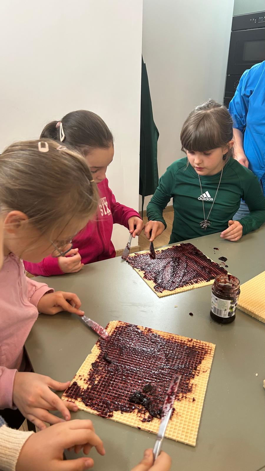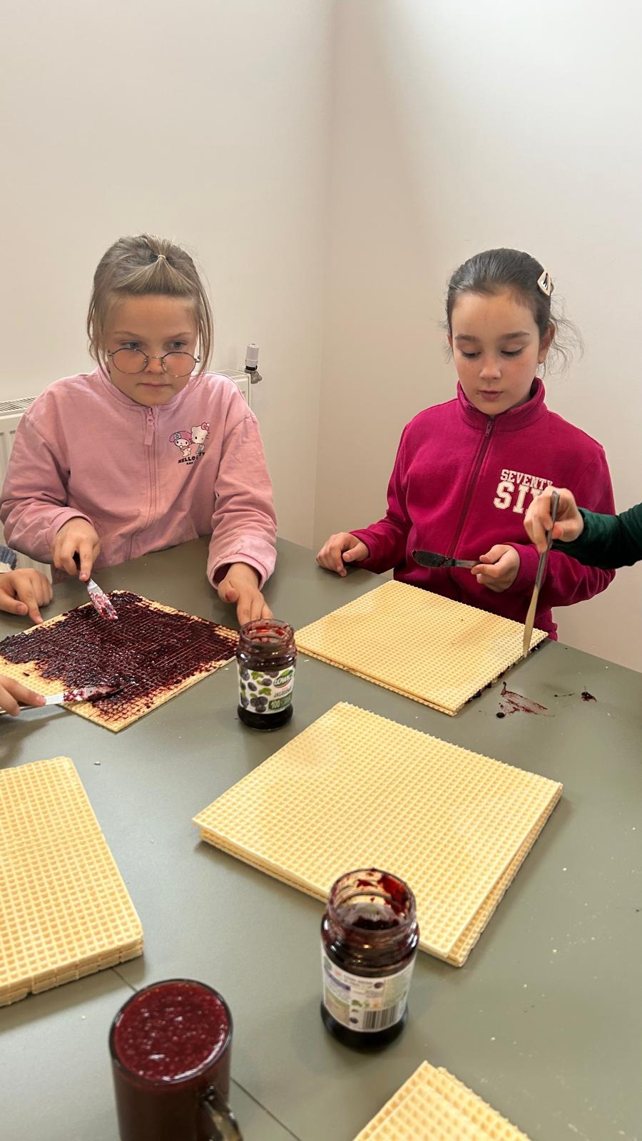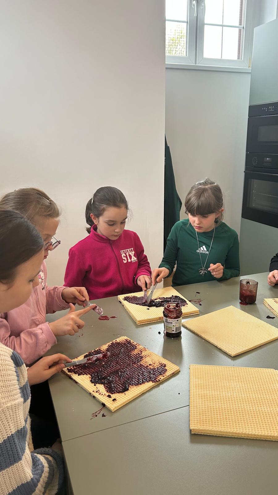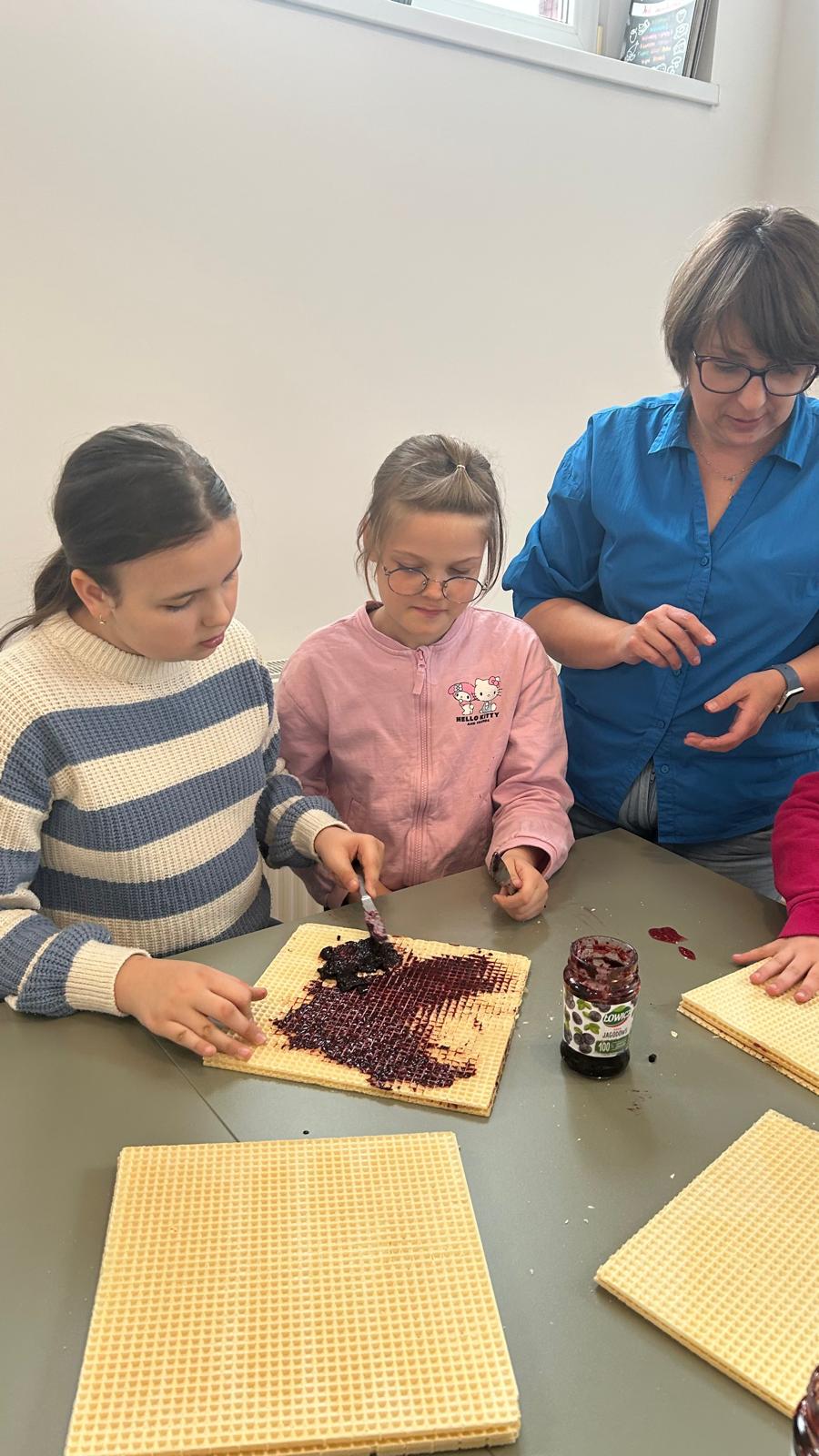 Podczas pierwszych zajęć w nowiutkiej „Kuchni Marzeń” nasi mali kucharze zmierzyli się z legendarnym deserem – domowymi piszingerami! Z ogromnym zaangażowaniem i uśmiechami na twarzach dzieci przekładały chrupiące wafle słodkim dżemem, ucząc się przy tym cierpliwości, dokładności i współpracy. Efekt? Najpyszniejsze słodkości na świecie – bo przygotowane własnoręcznie! Radosna atmosfera i cudowny zapach wafli wypełniły całą świetlicę. A to dopiero początek naszej kulinarnej przygody!