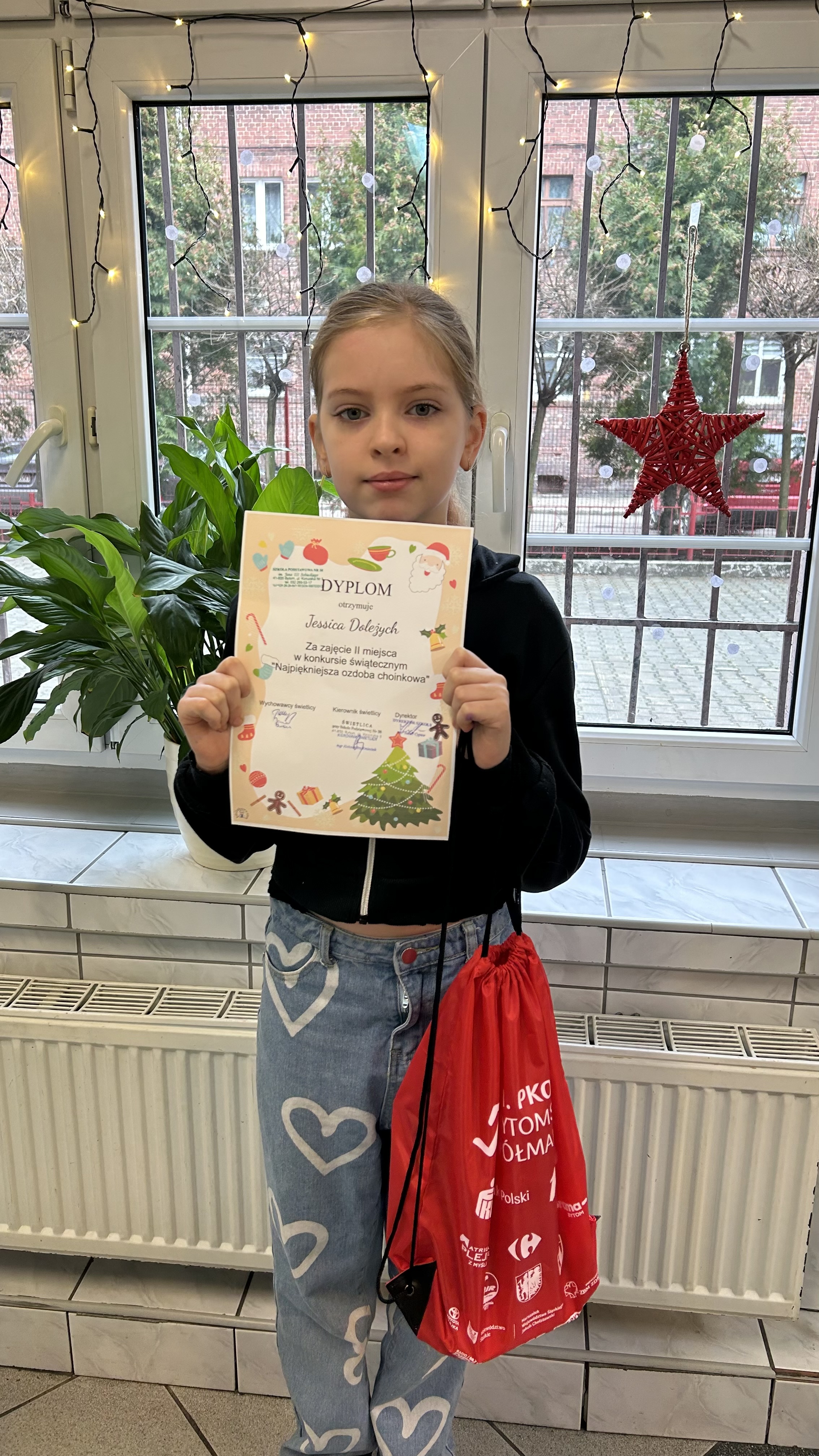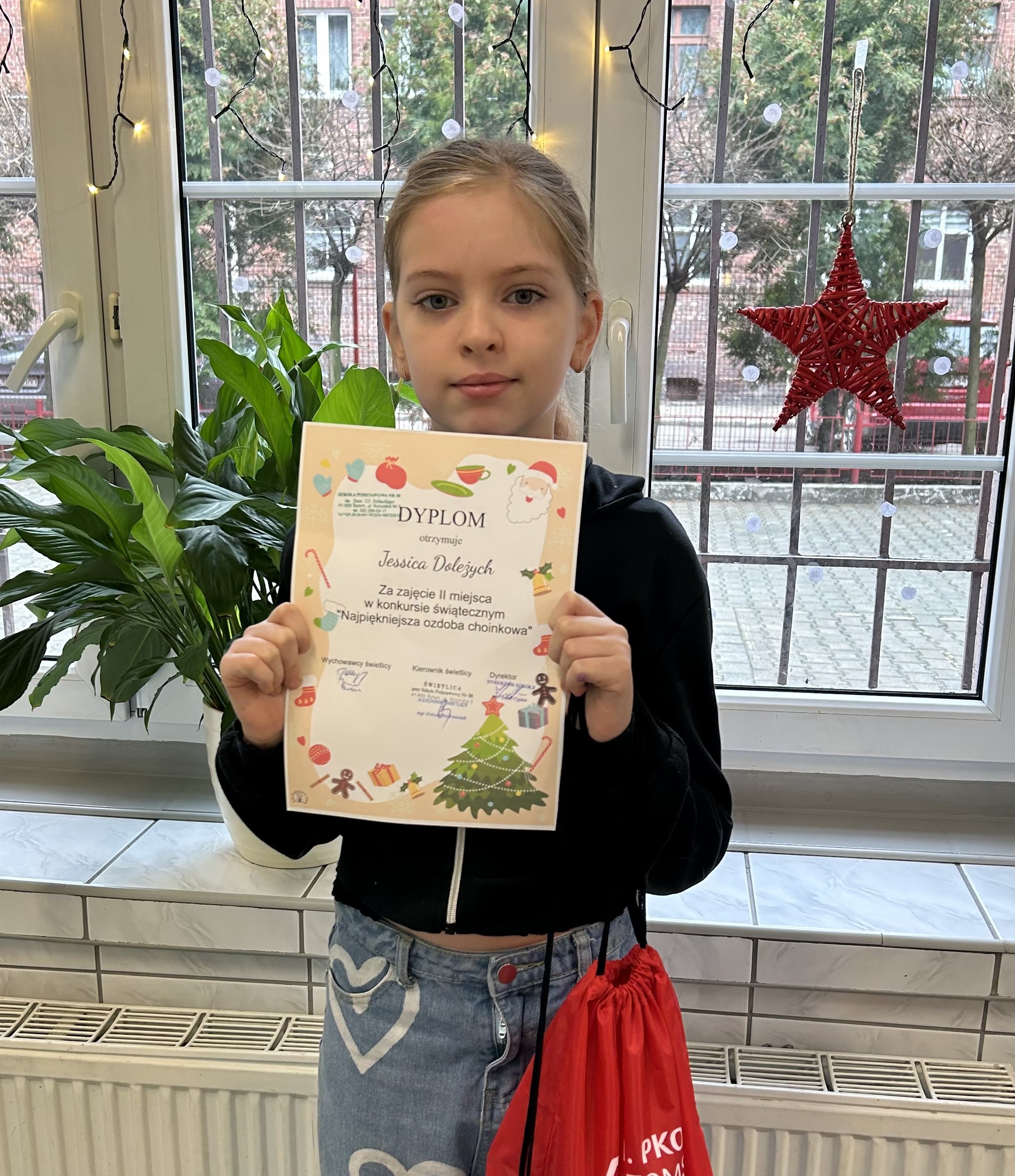 Mamy ogromną przyjemność zawiadomić, iż jedną z laureatek jest nasza uczennica Jesicca Doleżych z klasy III a, która zdobyła II miejsce w Międzyświetlicowym Konkursie Plastycznym na „Najpiękniejszą Ozdobę Choinkową” organizowanym przez Szkołę Podstawową nr 38 w Bytomiu.