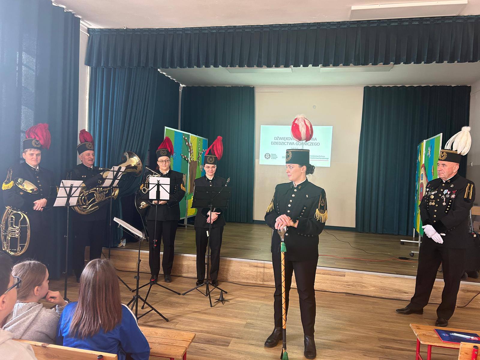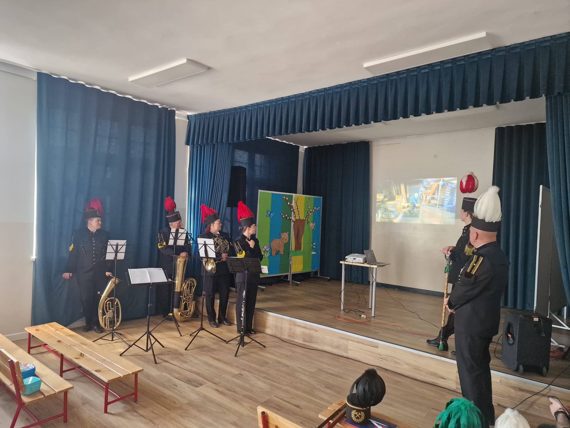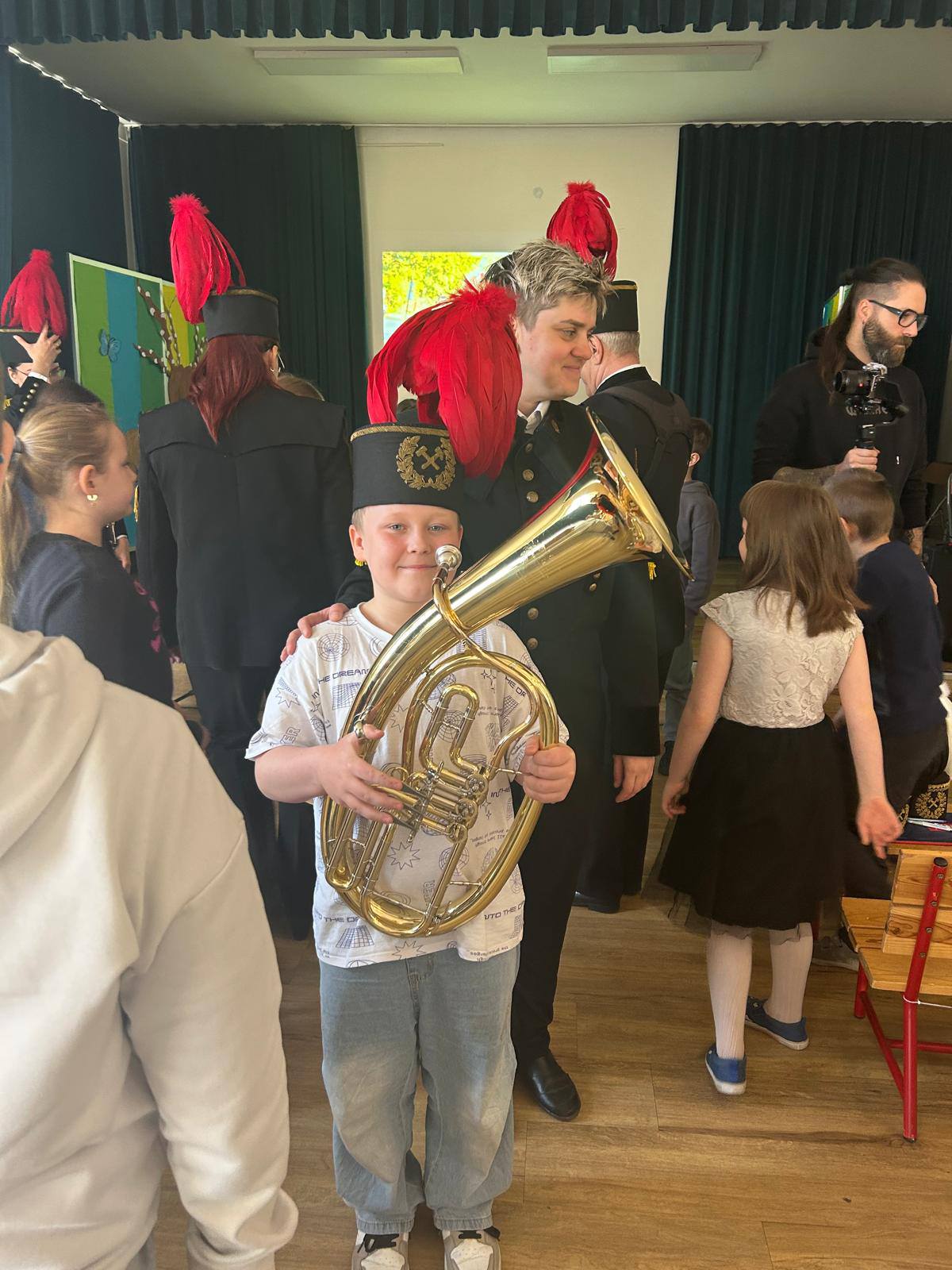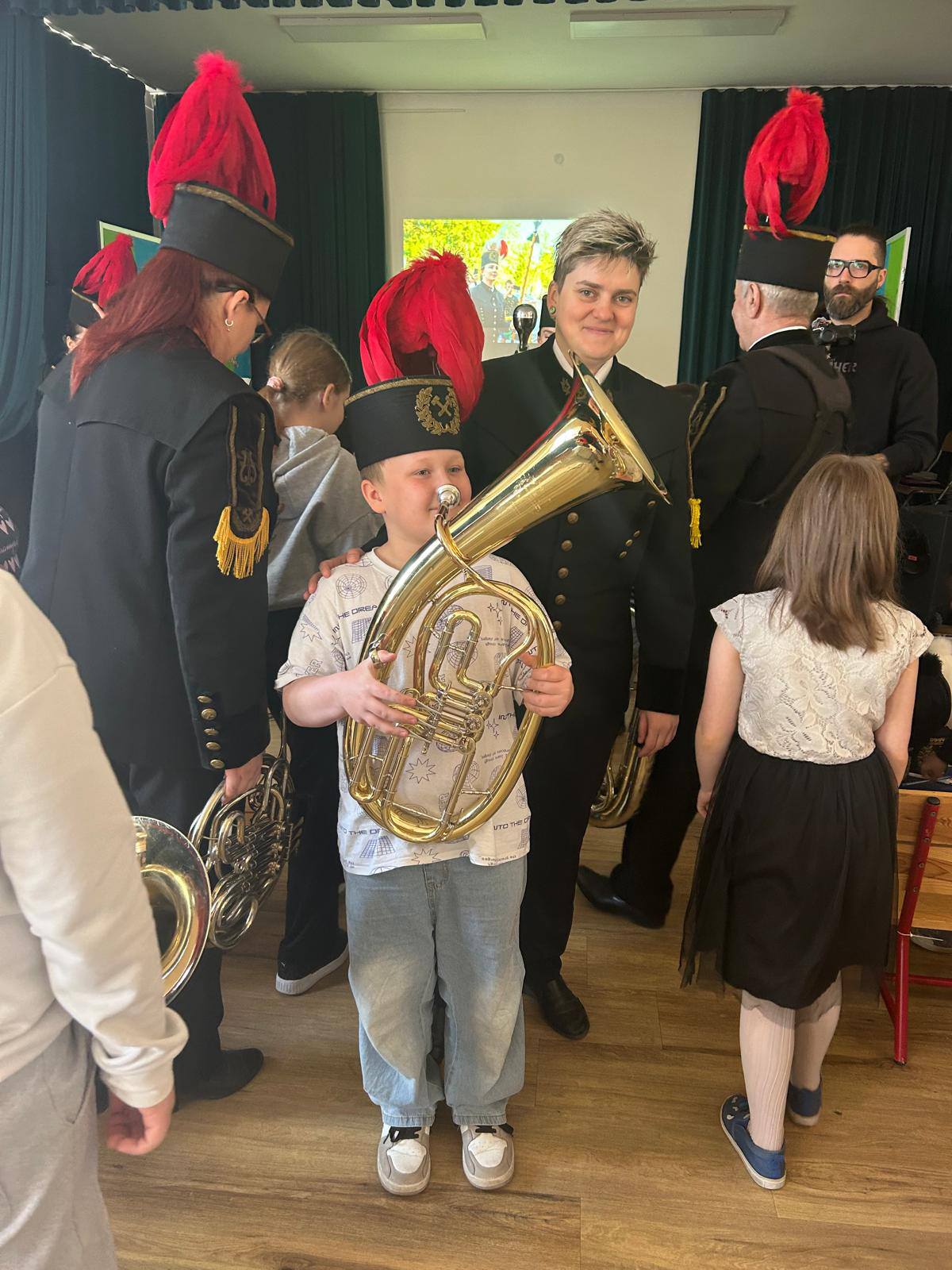 Dzisiaj odbyło się inspirujące spotkanie z muzykami z Muzeum Górnictwa. Spotkanie rozpoczęło się od krótkiej prezentacji strojów górniczych, instrumentów.
