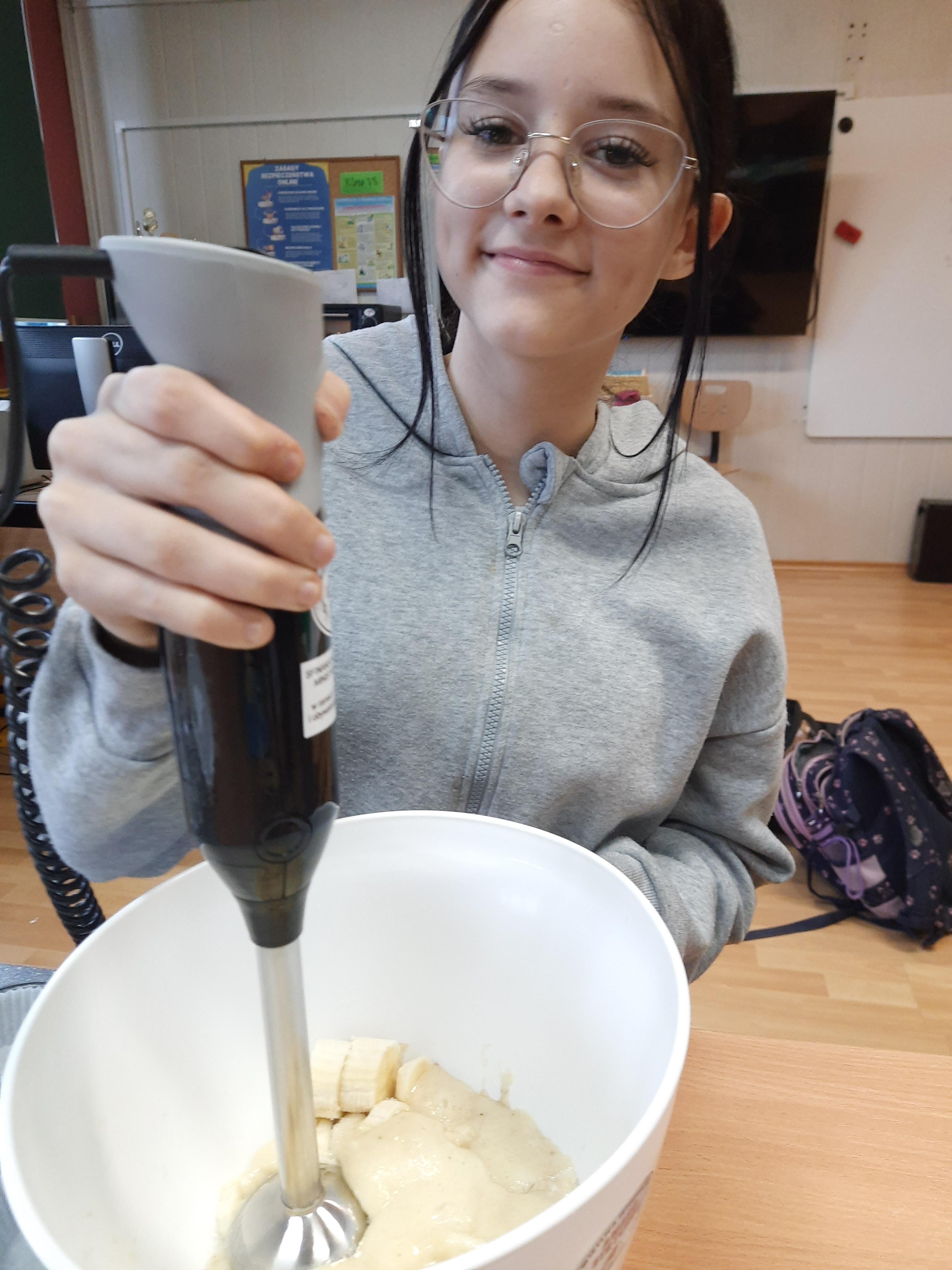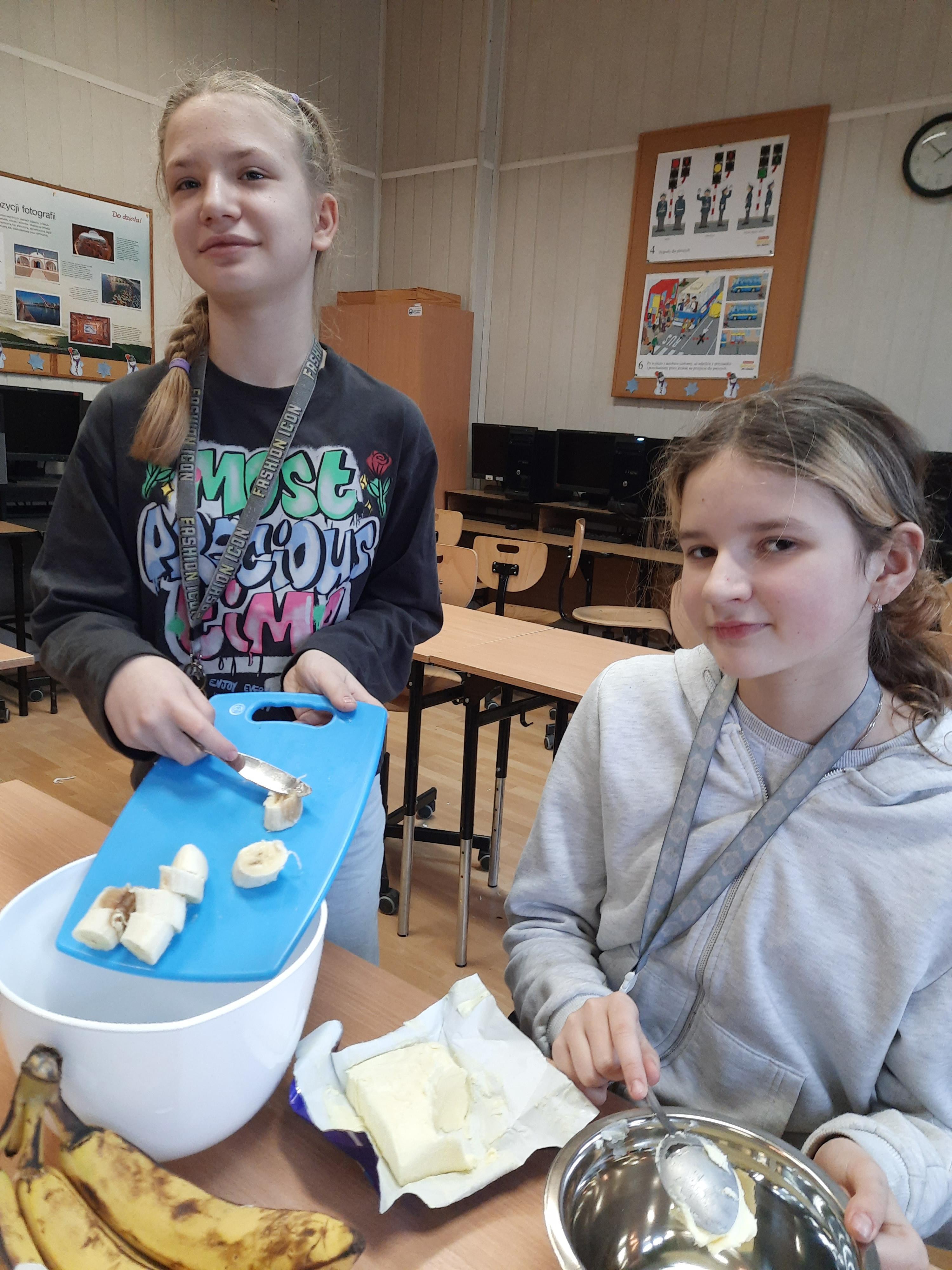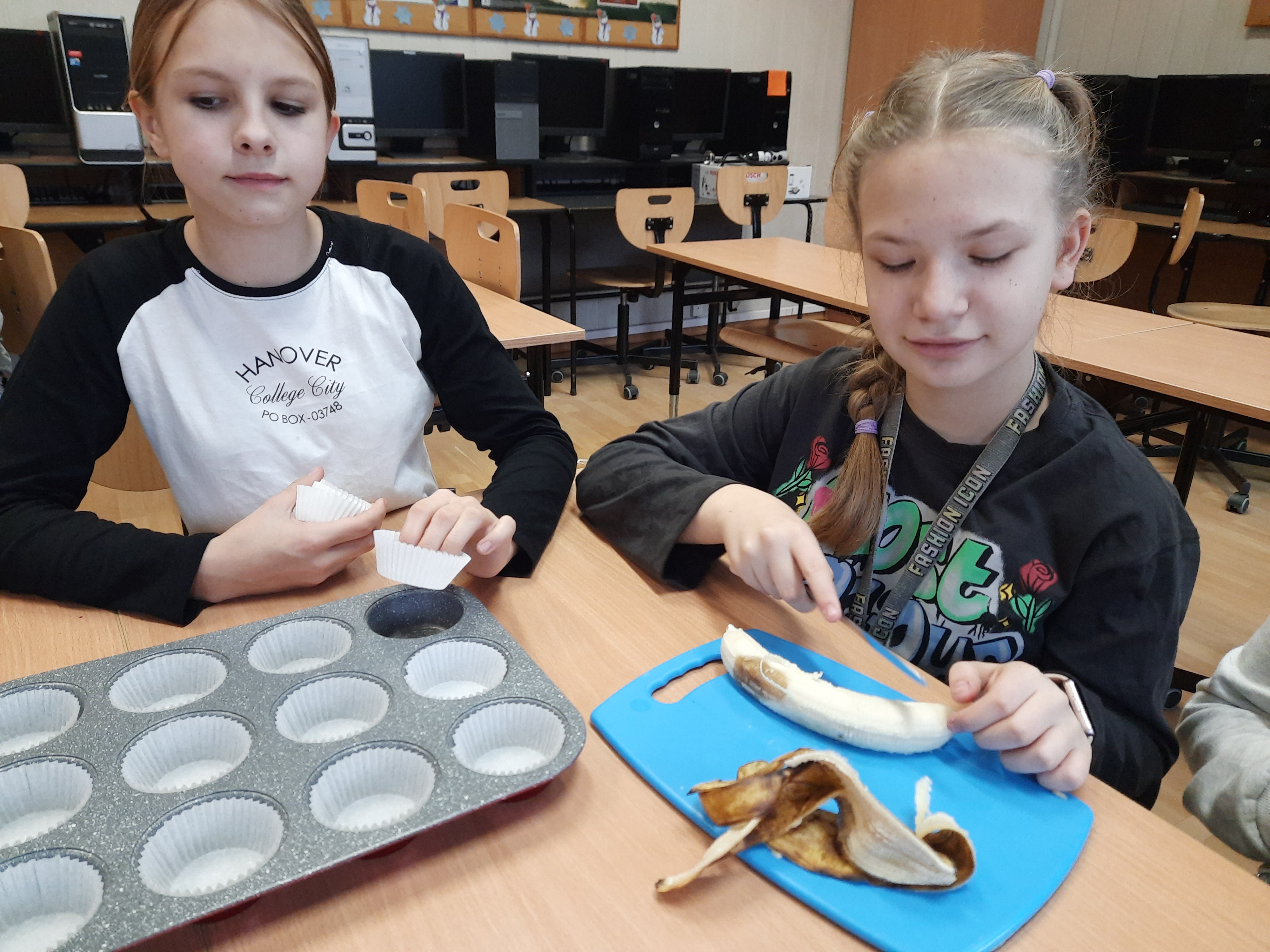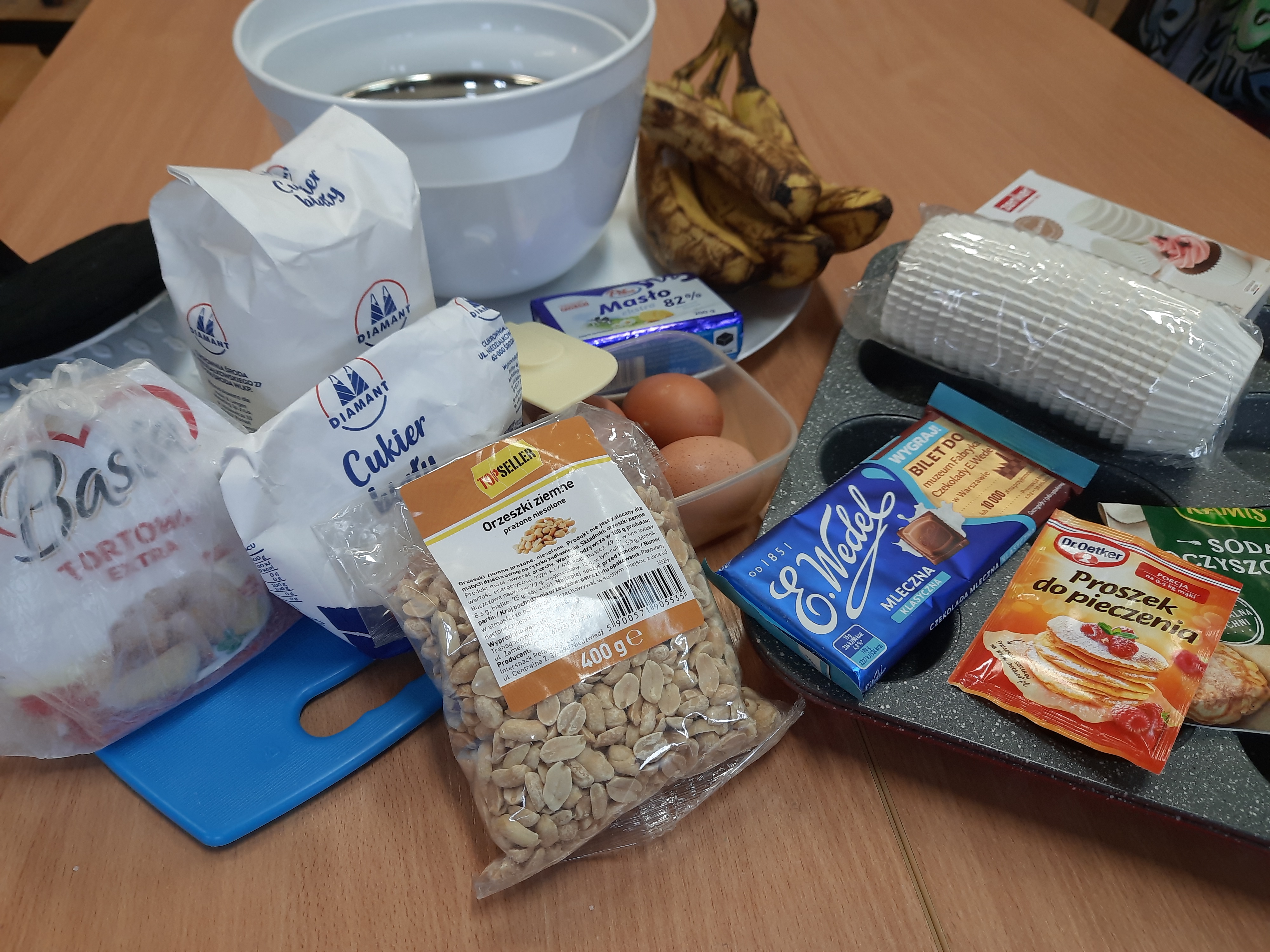 Uczniowie zapoznali się ze składnikami potrzebnymi do wykonania babeczek: dojrzałymi bananami, mąką, jajkami, masłem, cukrem, orzeszkami ziemnymi oraz czekolada do dekoracji. Już samo rozgniatanie bananów sprawiło uczestnikom wiele radości.
