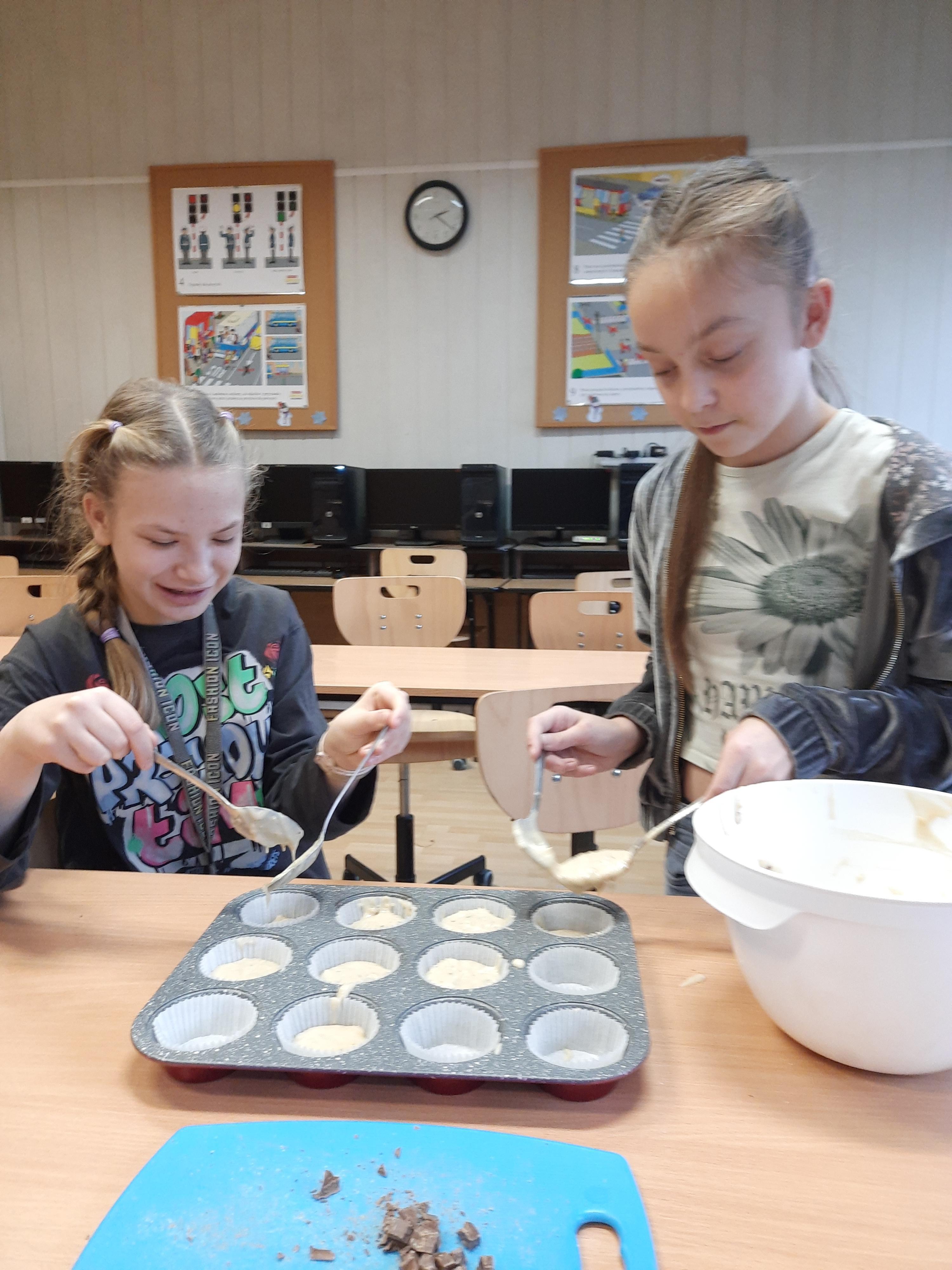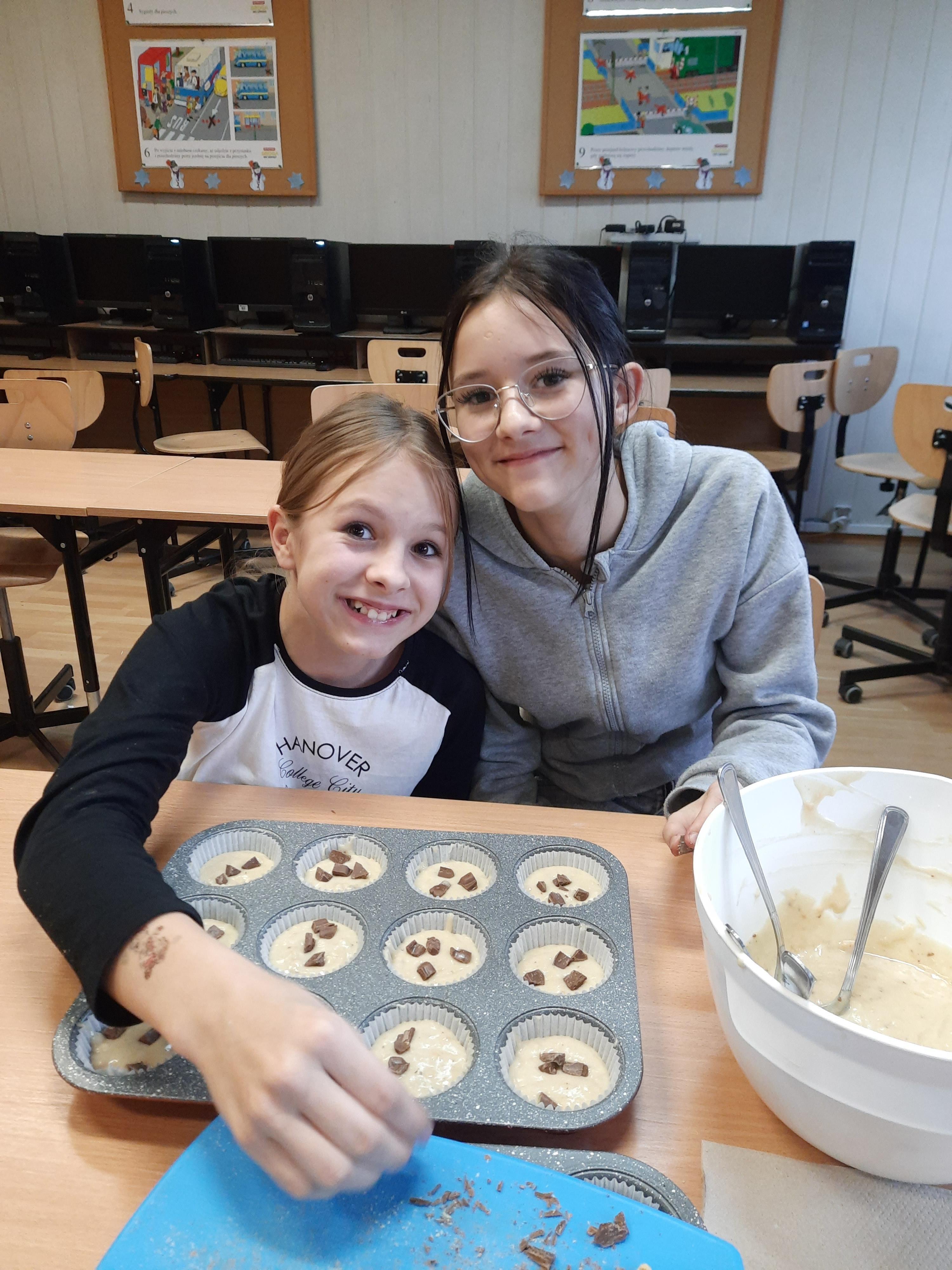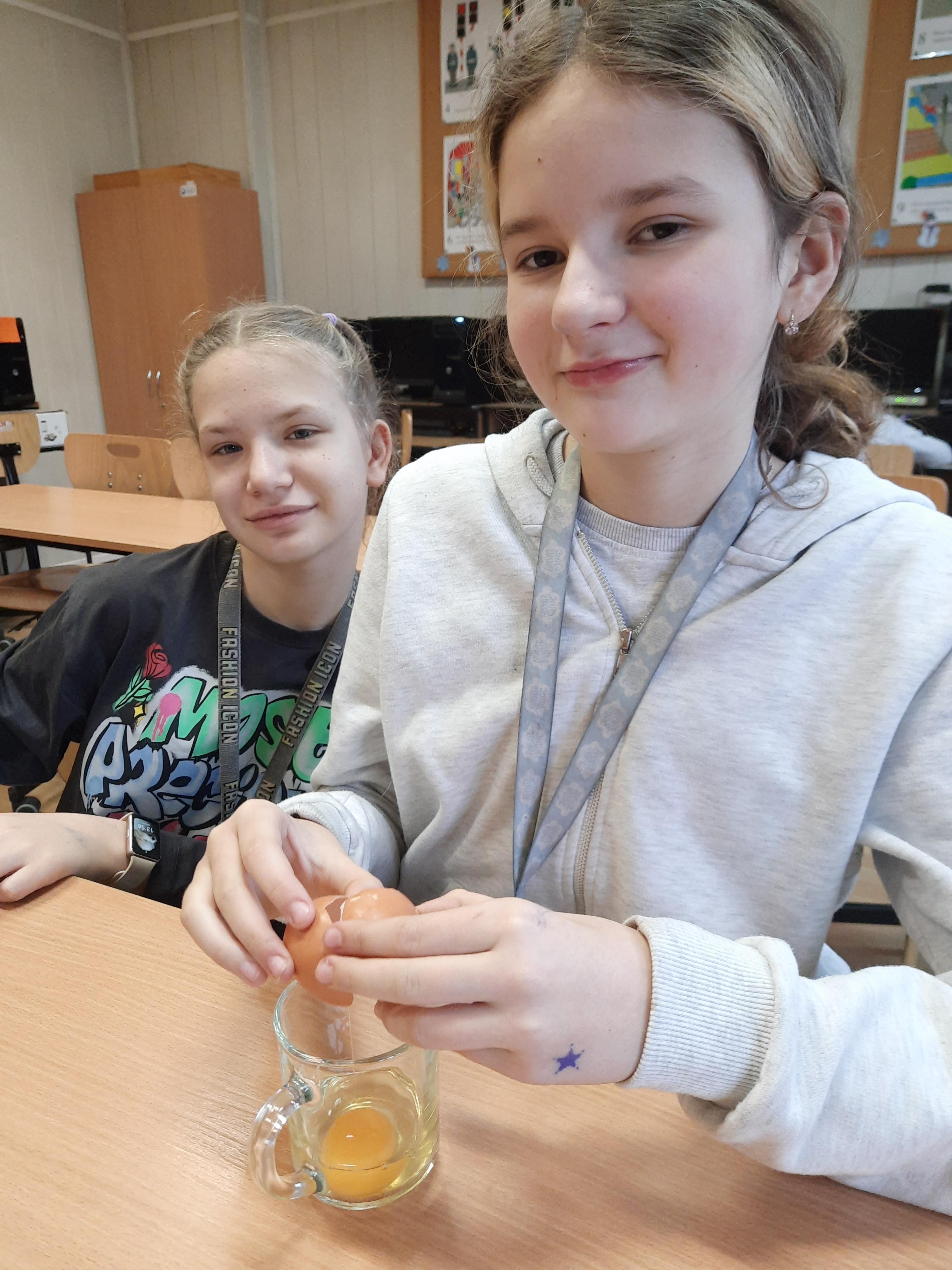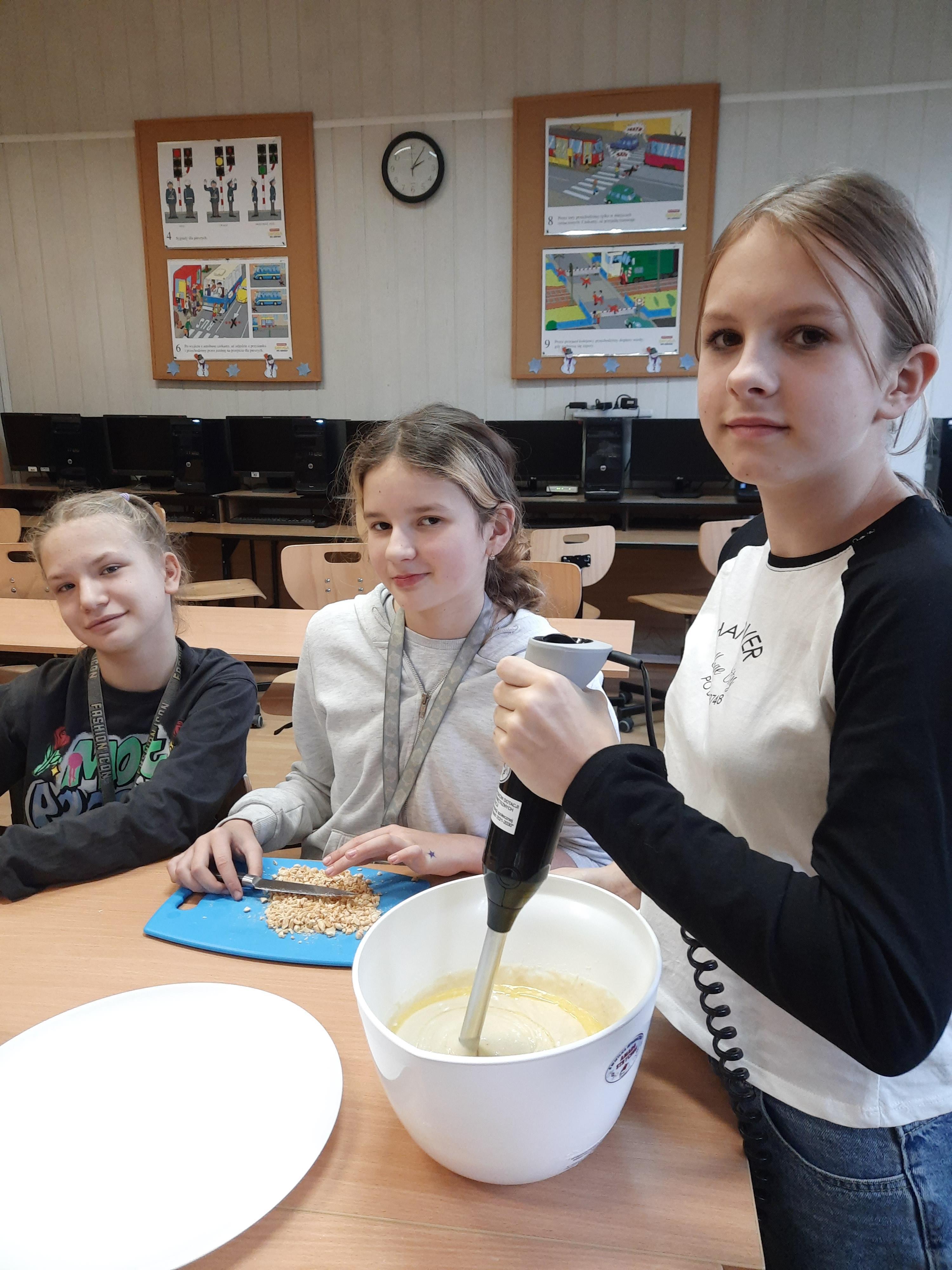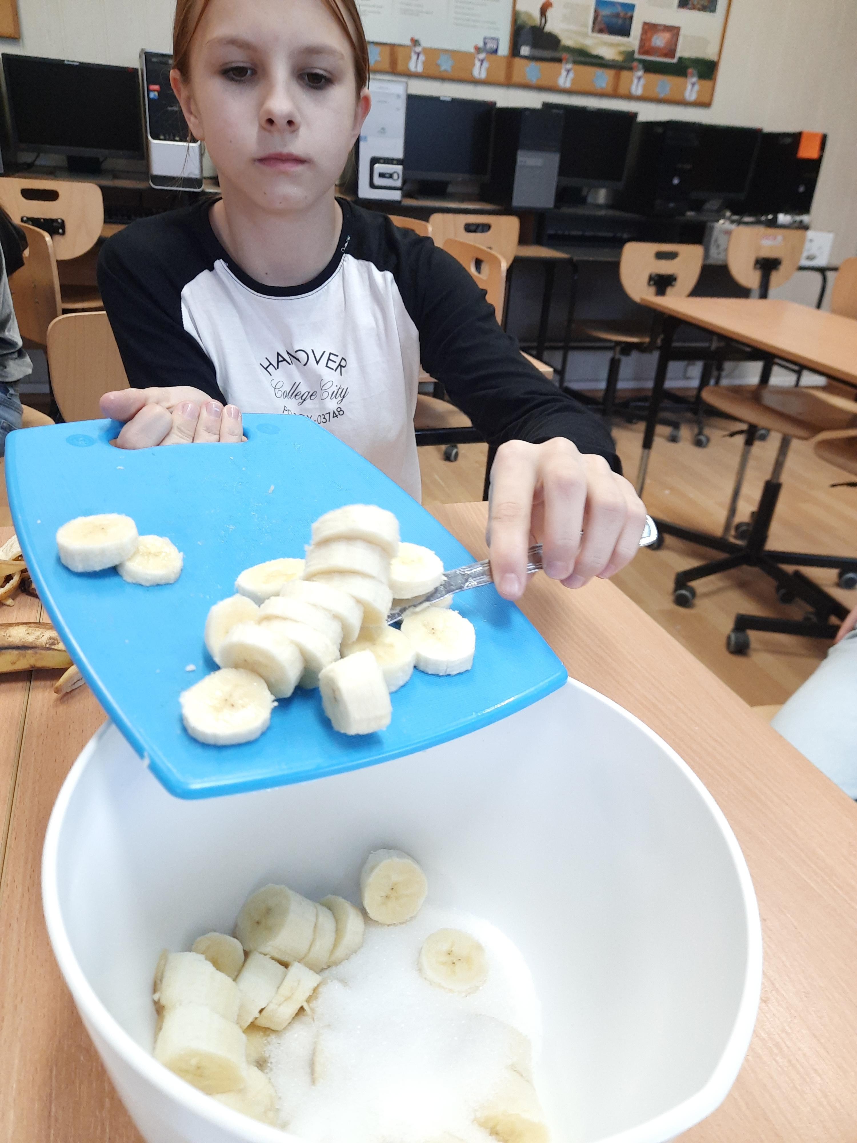 Uczniowie zapoznali się ze składnikami potrzebnymi do wykonania babeczek: dojrzałymi bananami, mąką, jajkami, masłem, cukrem, orzeszkami ziemnymi oraz czekolada do dekoracji. Już samo rozgniatanie bananów sprawiło uczestnikom wiele radości.